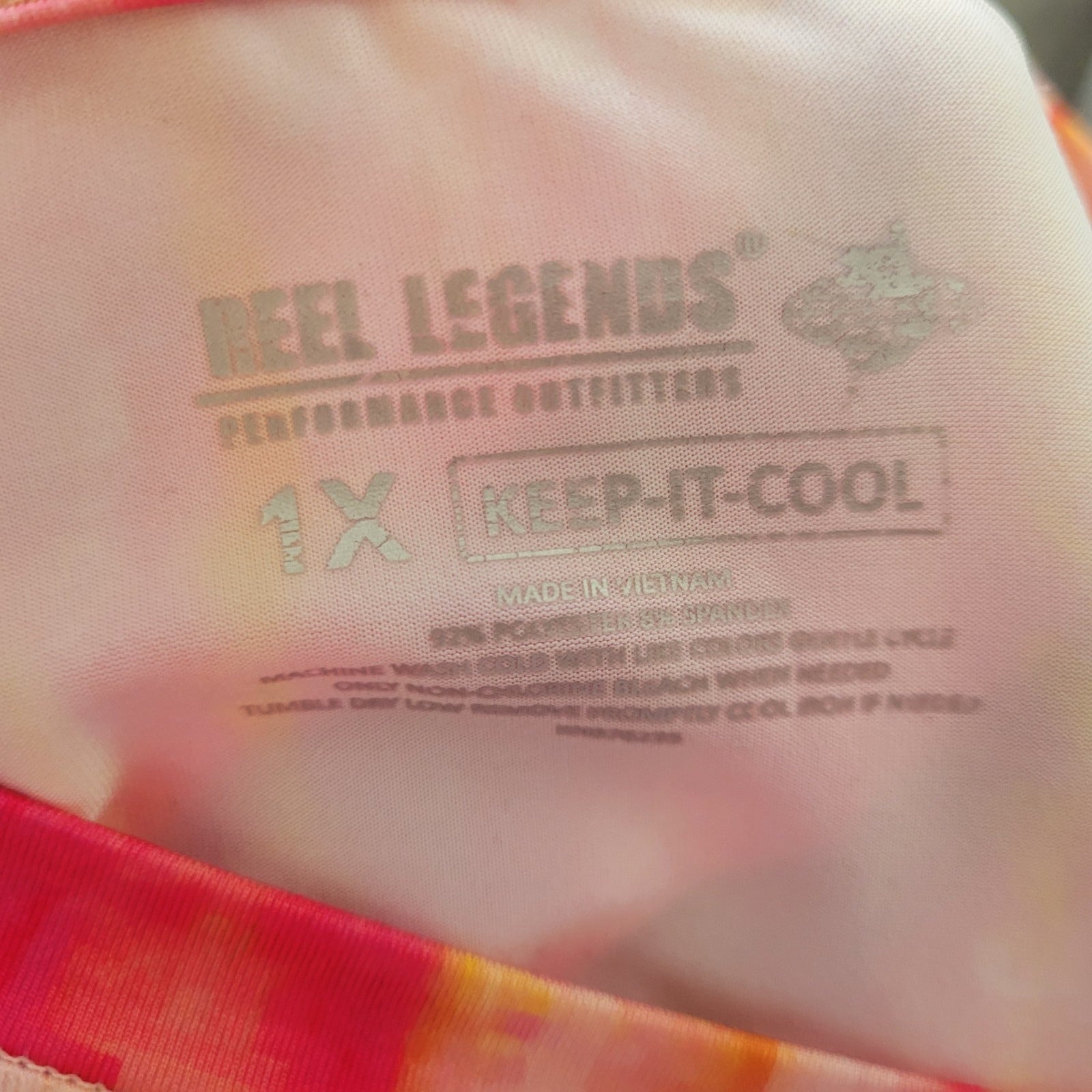 The Reel Legends Women's Top is a comfortable and stylish tee with 3/4 sleeves, perfect for casual or travel occasions. The pink and yellow watercolor design adds a fun and vibrant touch to the regular fit top. Made from a polyester blend jersey fabric, this pullover shirt is easy to care for with machine washable instructions. With features like stretch and all seasons wear, this top from the brand REEL LEGENDS is a versatile and flattering choice for women in size 1X plus.