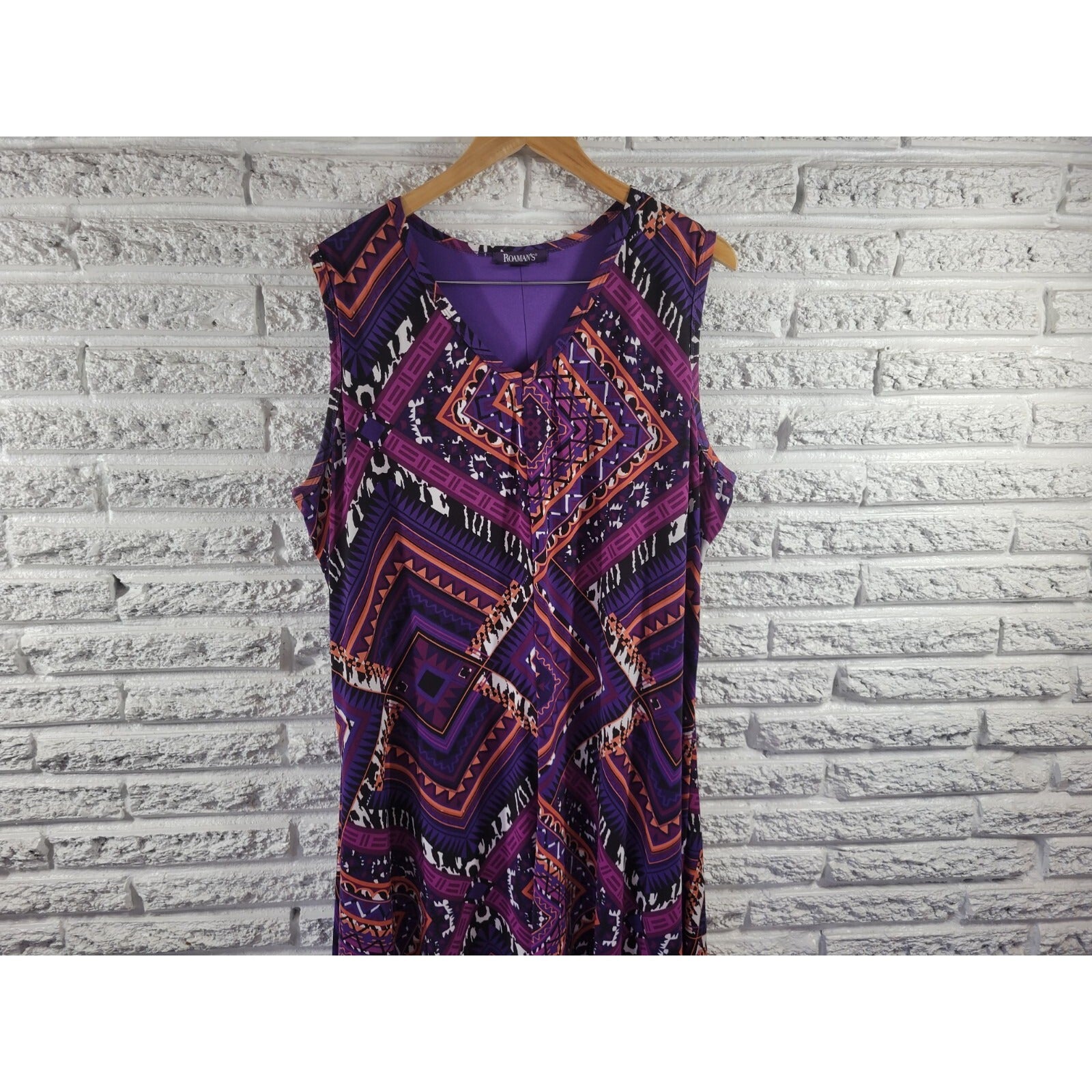 This Roaman's purple dress in size 22W is perfect for any casual occasion. Made of a comfortable and stretchy polyester blend material, this midi-length dress features a stylish geometric pattern and an asymmetric hemline. The sleeveless design and round neckline make it ideal for warmer seasons, but it can also be layered for cooler weather. The dress is pullover-style and can be machine washed for easy care. This women's dress from Roaman's is fully lined, adding to its quality and durability. It's a great addition to any wardrobe and can be personalized with accessories or worn as is. The dress is perfect for all four seasons, making it a versatile piece for any woman's closet.