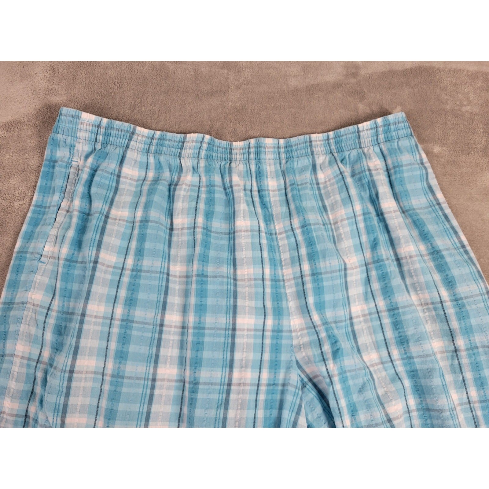 Roamans Womens Shorts in size 30W are made of lightweight, machine washable cotton seersucker fabric with a blue plaid pattern. The shorts have a high-rise, elastic waist and a pull-on closure. They feature slash pockets and have a chino style. These shorts are suitable for casual occasions and can be worn in all seasons.
