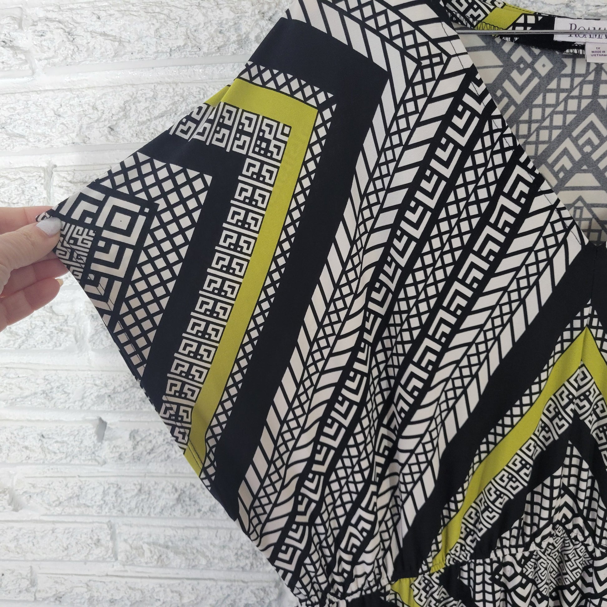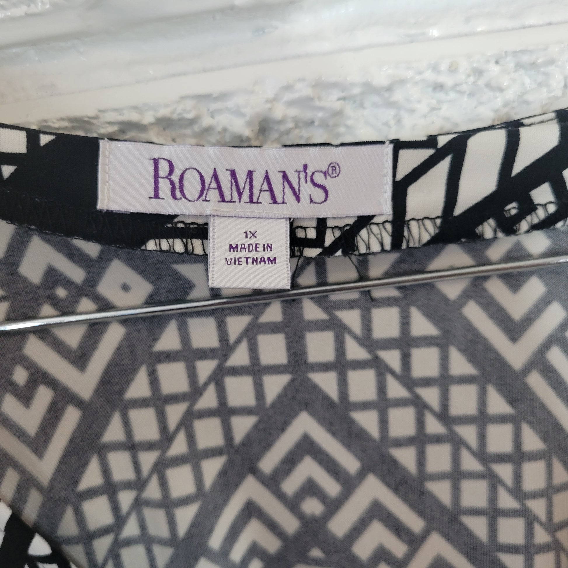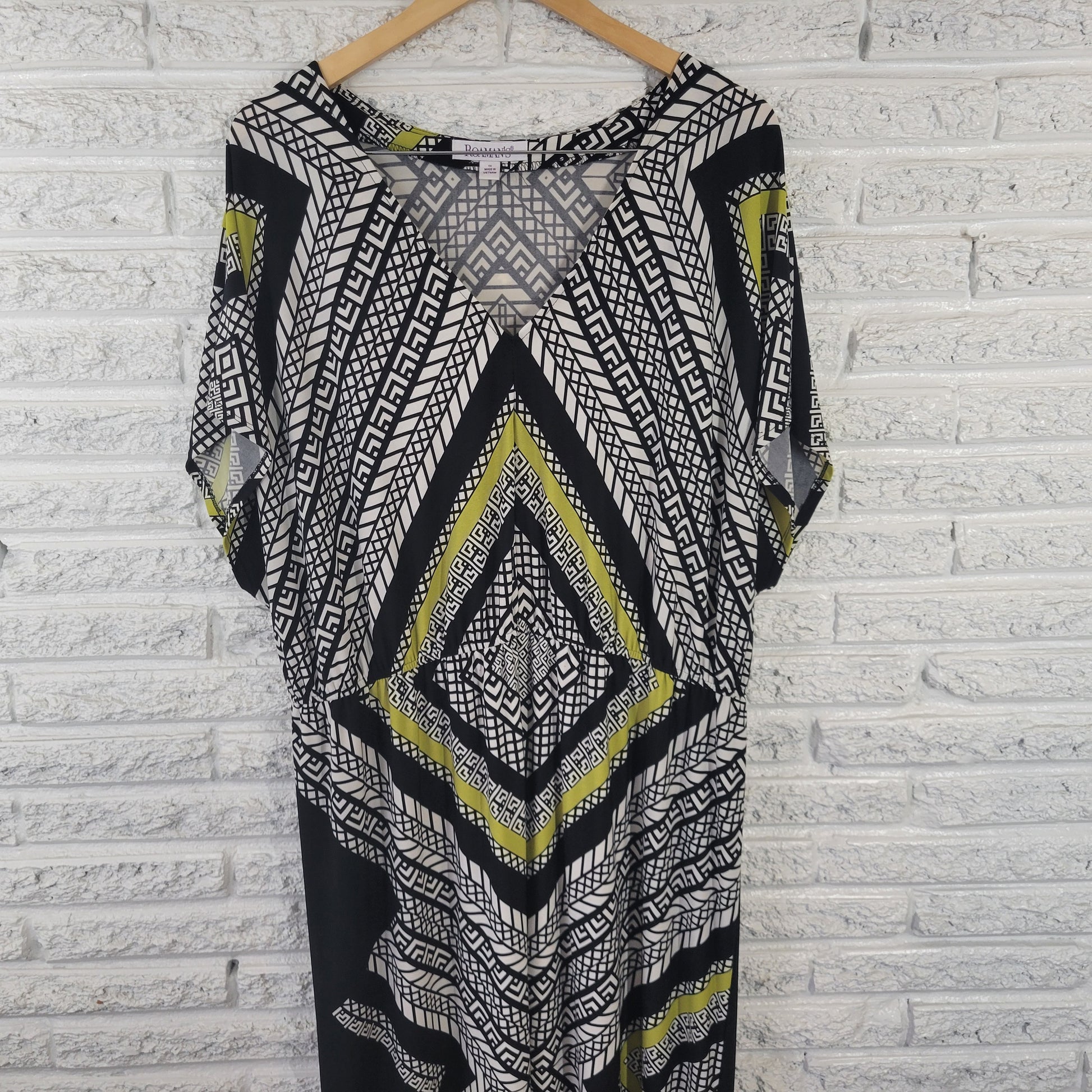 The Roaman's Women's Dress in size 1X features a stylish black and green geometric pattern, short cap sleeves, and a V-neckline. Made from a comfortable polyester blend, this long maxi dress is perfect for travel and casual occasions. With a pullover closure and stretch features, this machine washable dress is designed for year-round wear in all seasons. The plus size design and brand reputation make it a great choice for women looking for both style and comfort in their wardrobe.