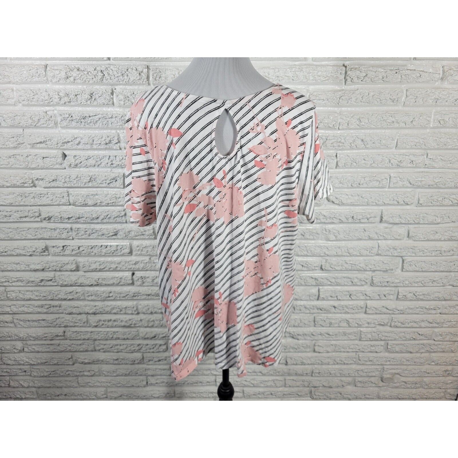 Roamans Womens Top 1X Tee Short Sleeve Pink Floral Cotton Casual Back Keyhole