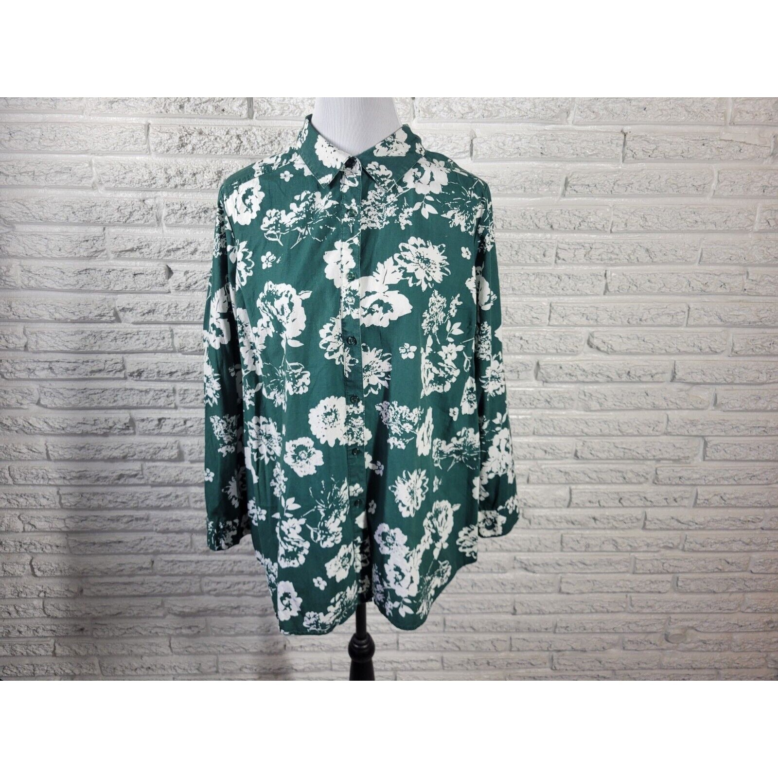 Roamans Womens Top 20W Long Sleeve Green Floral Cotton Collar Casual Button Up
