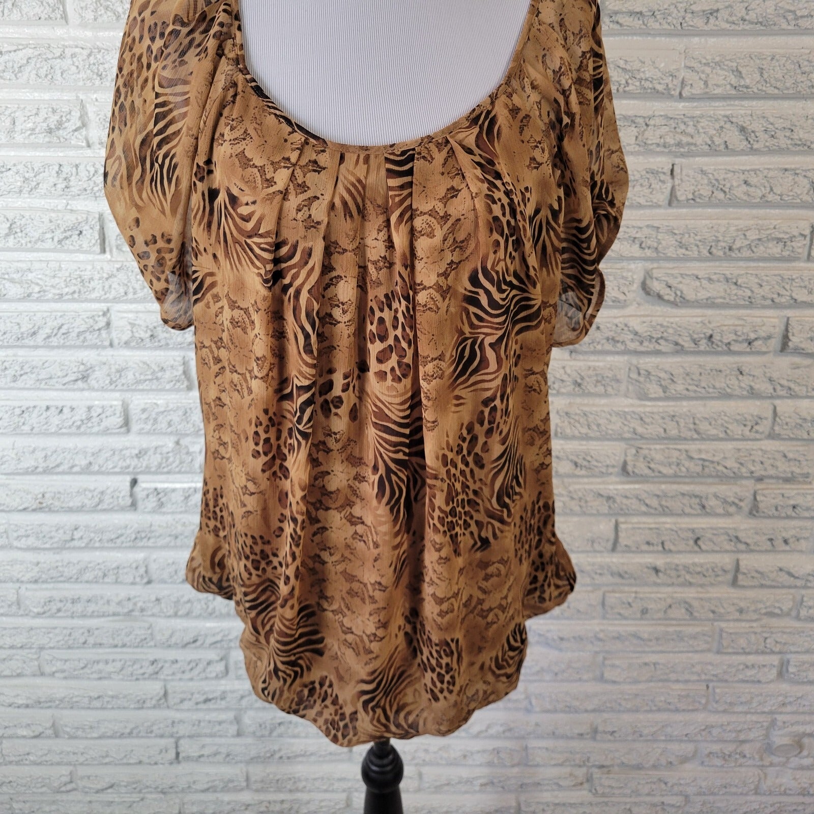 Roz Ali Womens Top 2X Plus Sheer Sleeve Brown Animal Print Polyester Pleated