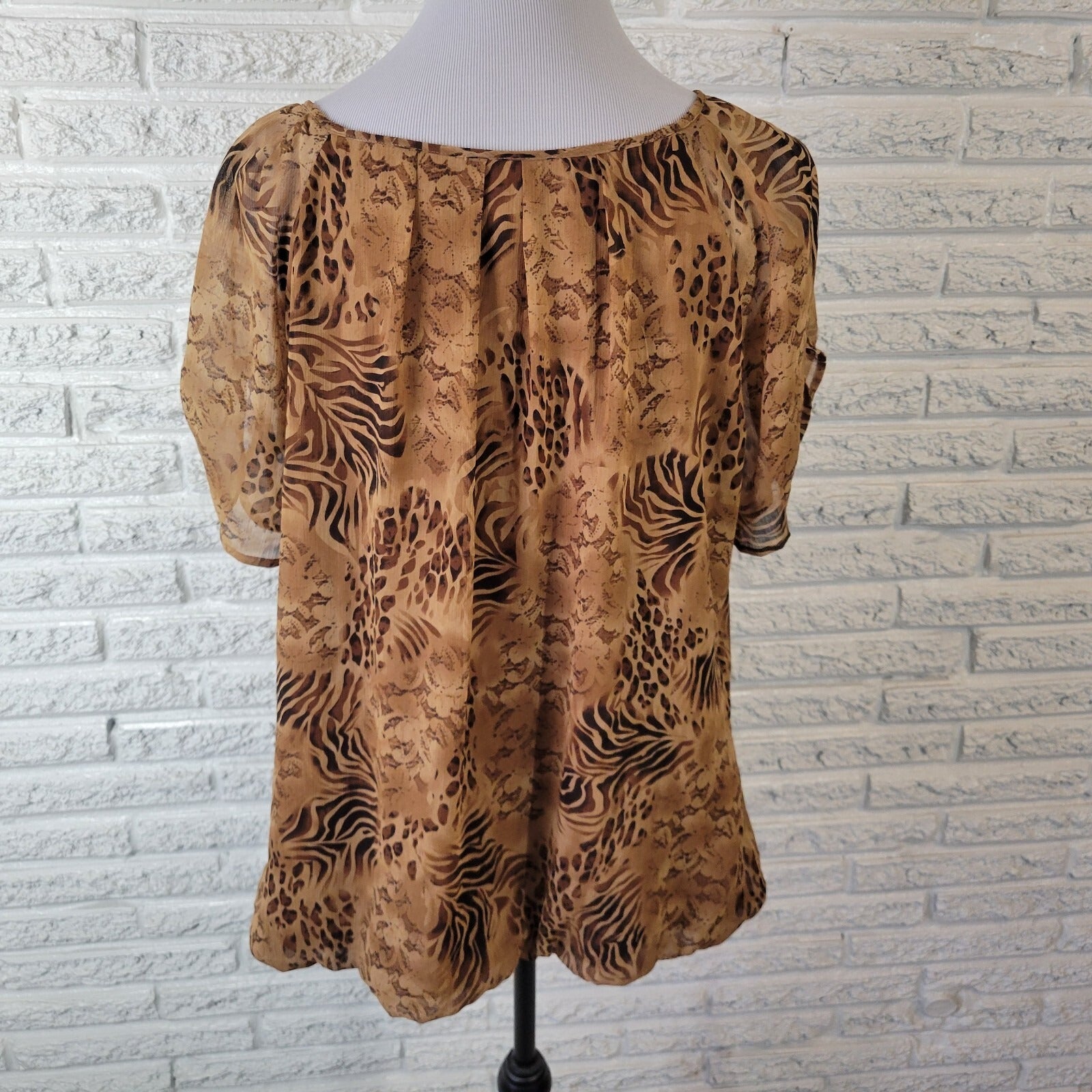 Embrace effortless style with the Roz And Ali women's top in a versatile brown animal print. The pleated detailing adds a touch of texture and sophistication, while the short, casual sleeves and boat neckline create a relaxed silhouette perfect for any casual occasion or your next trip. Crafted from a comfortable polyester material, this blouse is designed to provide a regular fit for plus-size women, ensuring both comfort and ease of movement. The elastic waist and stretch features offer a flattering fit, and the lined interior provides additional coverage for the sheer fabric. Machine washable for easy care, this top is a practical addition to your wardrobe for all seasons.