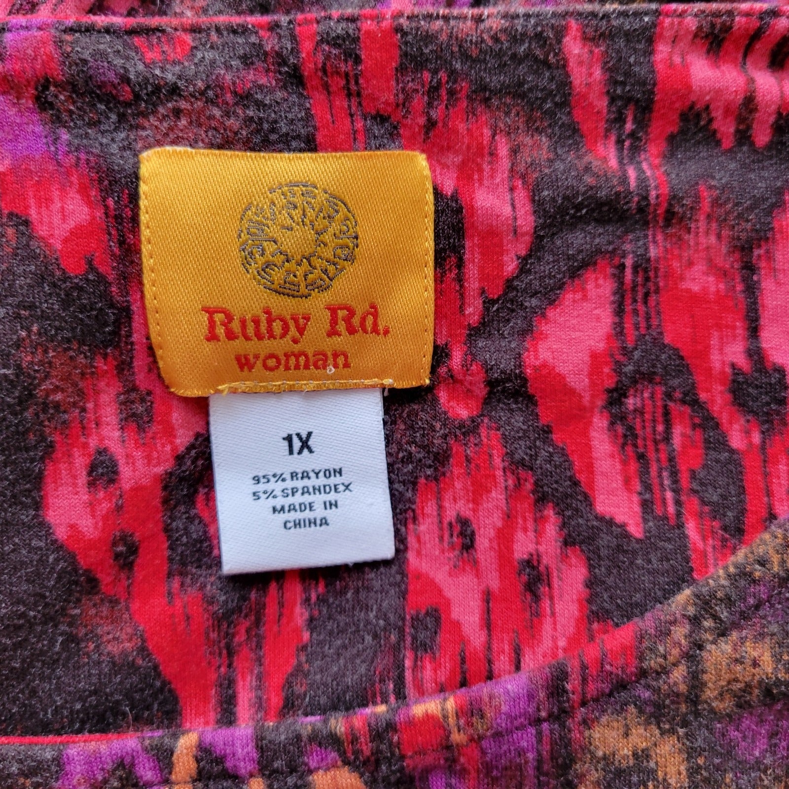 The Ruby Rd Women's Top in 1X Plus size features a stylish pink and brown watercolor design, making it perfect for a casual, travel outfit. With a comfortable round neckline and 3/4 sleeves, this pullover top is made of a stretchy spandex and rayon blend, suitable for all seasons. The asymmetric hem adds a trendy touch to this basic yet versatile top, which is machine washable for easy care. Perfect for a variety of occasions, this top by RUBY RD. is a must-have for any woman's wardrobe.