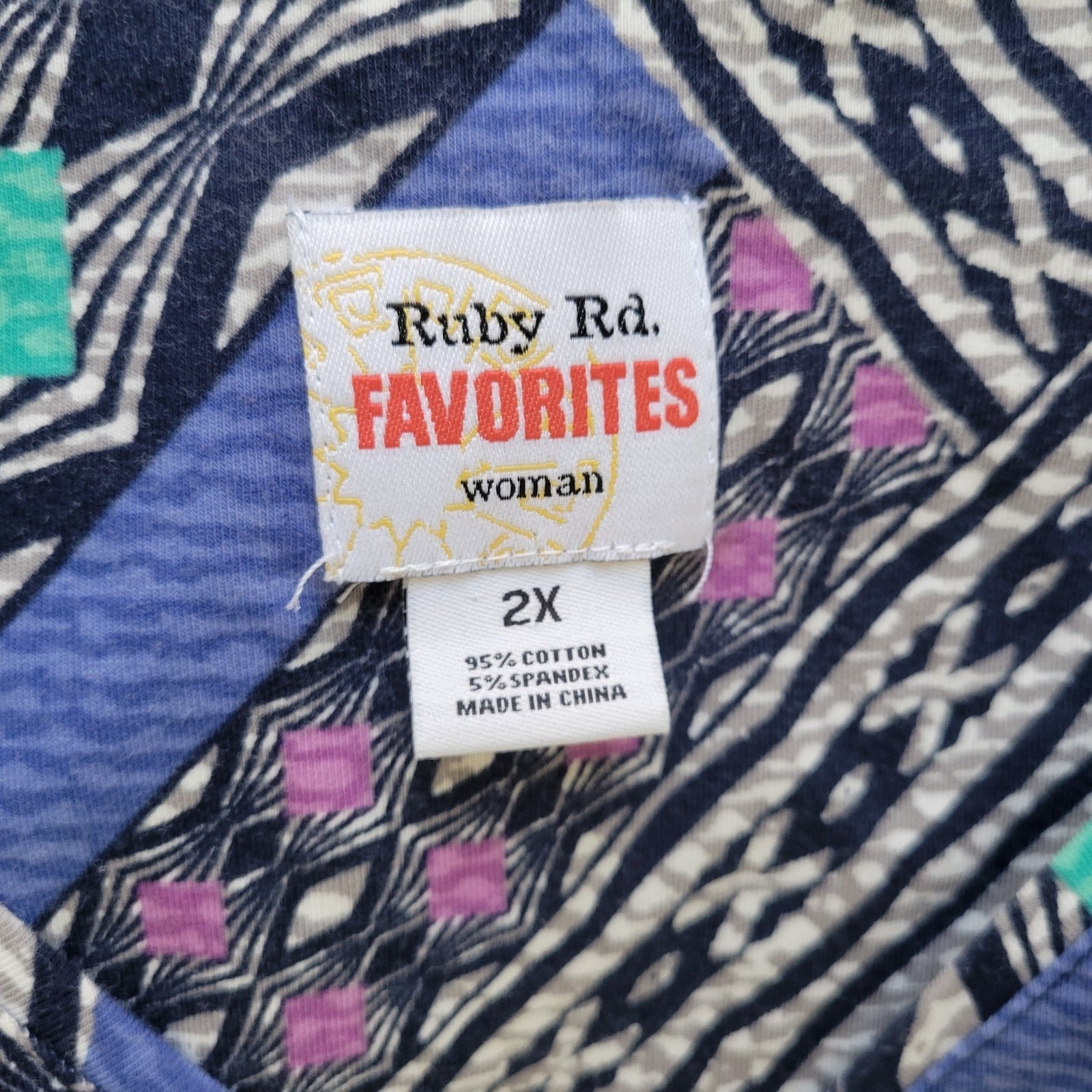 The Ruby Rd Women's Plus Top in size 2X features a blue/black geometric pattern, 3/4 sleeves, and a V-neckline. Made from a comfortable cotton blend material, this casual and comfortable blouse is perfect for travel or everyday wear. The pullover closure and stretch fabric make it easy to wear and care for with machine washable instructions. Ideal for all seasons, this basic yet stylish top is a versatile addition to any woman's wardrobe.