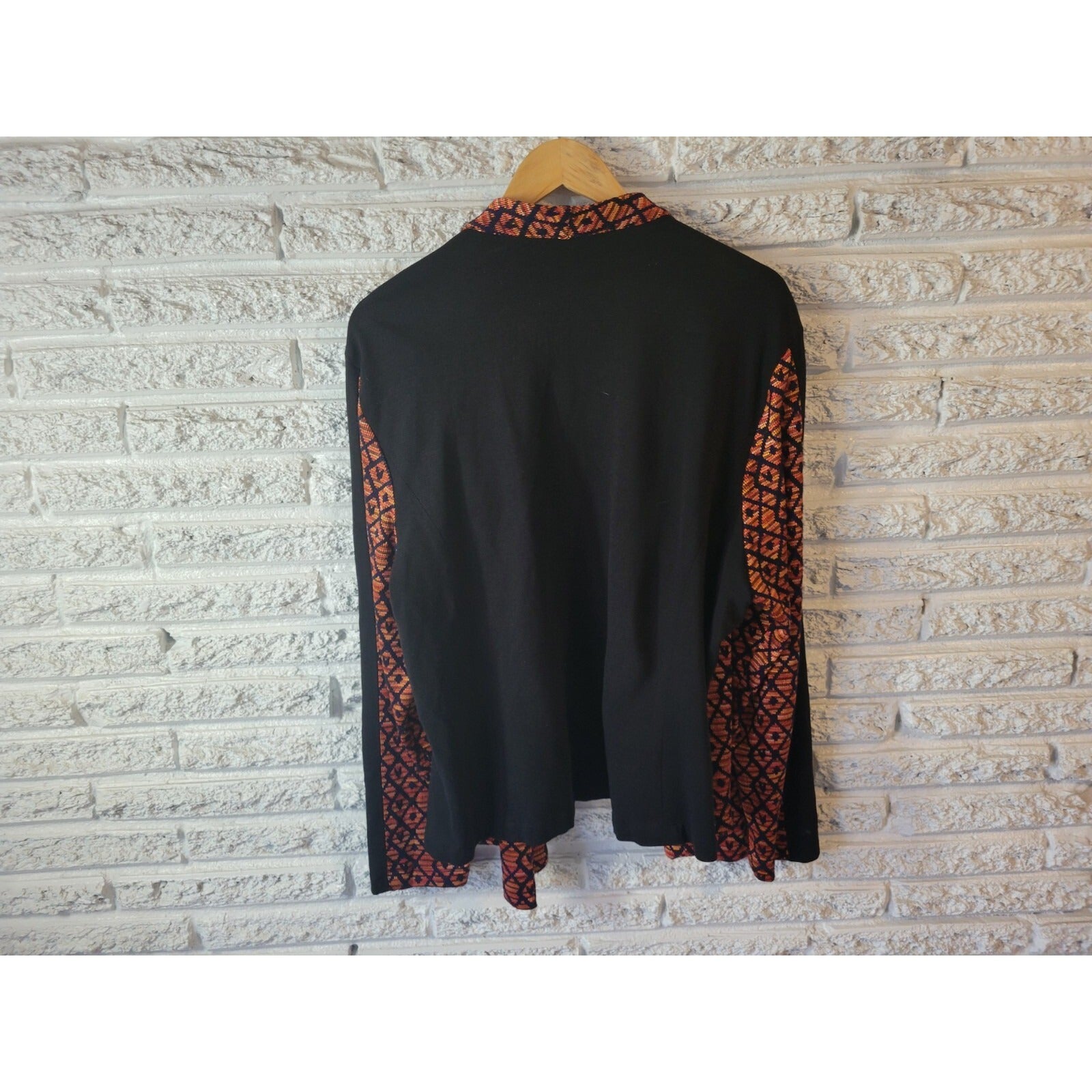 Elevate your casual style with this stunning black shacket jacket from Ruby Rd. The geometric pattern on this blouse adds an edgy yet chic touch to your wardrobe. Its long sleeves and pullover closure make it a perfect fit for any casual occasion.   This blouse is made of a comfortable polyester and acrylic knit fabric, which makes it stretchy and machine washable. It comes in a regular fit and size type plus, and its open features make it a versatile piece for all seasons. This top is perfect for women who love basic style with a twist.