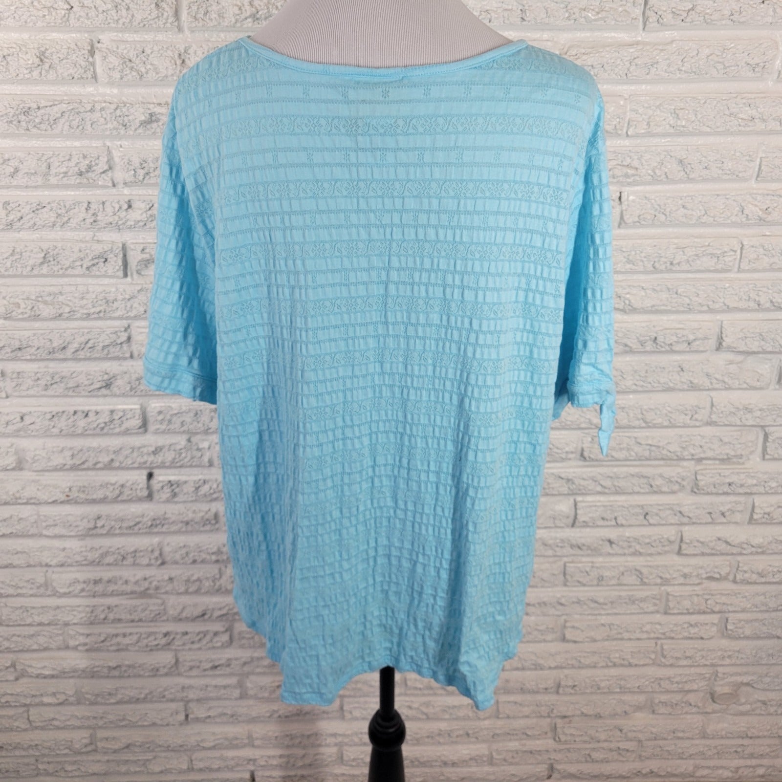 This Ruby Rd Women's Top in size 2X is a comfortable and lightweight blue tee with a casual short sleeve design and eyelet detailing. Made from a cotton blend jersey fabric, this pullover top is perfect for travel and casual occasions. Its solid pattern and round neckline make it a versatile wardrobe staple suitable for all seasons. Easy to care for with machine washable instructions, this plus size T-shirt by RUBY RD. offers a regular fit for a comfortable and stretchy feel.