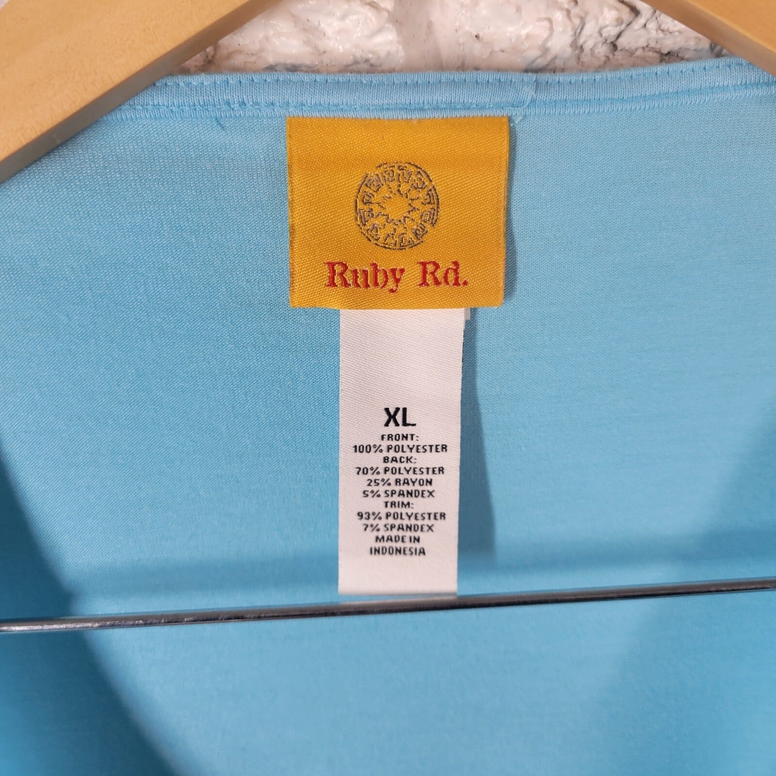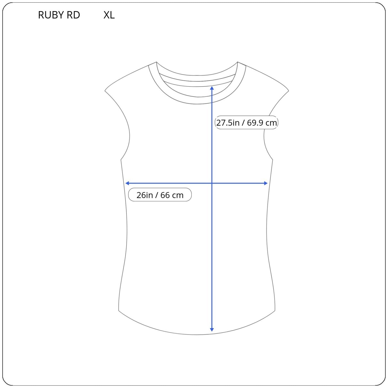Ruby Rd. presents a stylish and comfortable women's top that's perfect for any casual occasion or your next trip. This extra large tee features a classic round neck and a sleeveless design, ideal for layering or wearing on its own during warmer seasons. The blue Venice cityscape print adds a touch of charm and wanderlust, making it a great conversation starter. Crafted from soft polyester jersey fabric, this top offers a lightweight feel with just the right amount of stretch to maintain its shape and provide ease of movement. It's machine washable for hassle-free care, and its versatile style ensures it pairs well with jeans, shorts, or skirts alike. Whether it's fall, spring, summer, or winter, this RUBY RD. tee is an everyday basic that belongs in every wardrobe.