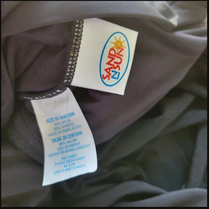 Get ready for a day at the beach or pool with this stunning Sand n Sun women's swimsuit. The black one-piece swimsuit is made with a combination of nylon and spandex materials for a comfortable fit. The plus-size swimsuit is perfect for those who want to make a statement while feeling confident and comfortable.   This swimsuit is easy to care for and should be hand washed only. It also comes with a lined feature for added comfort. The Sand n Sun brand is known for its quality products, and this swimsuit is no exception. Whether you're lounging by the pool or taking a dip in the ocean, this swimsuit is the perfect choice.