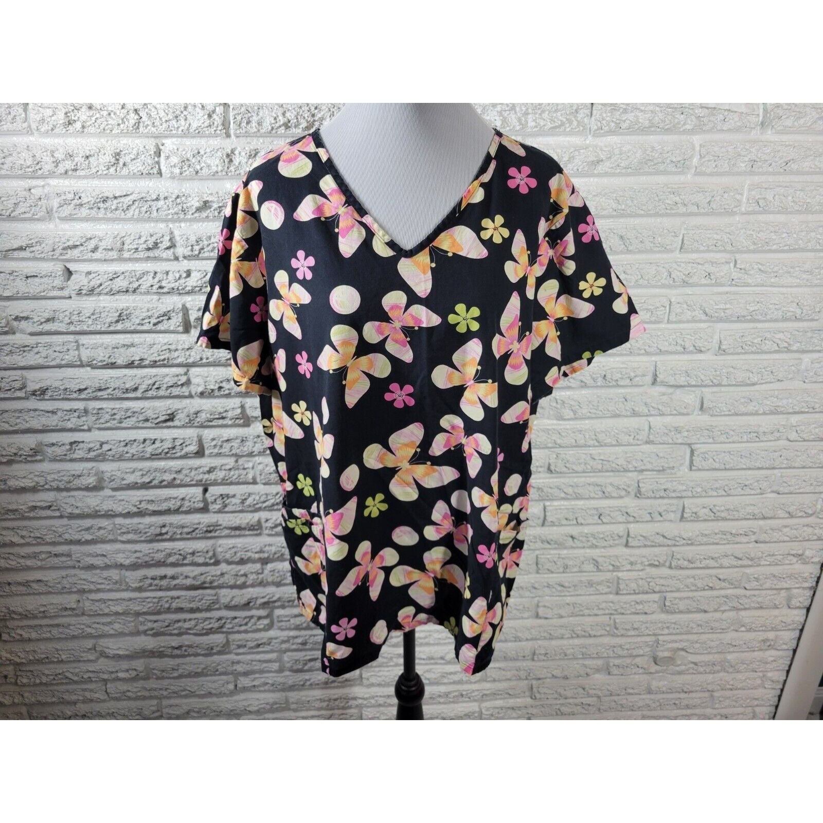 This SB Scrubs unisex top in size 2X features a playful butterfly and floral pattern in black, made of comfortable cotton material. It includes convenient pockets and short sleeves, perfect for medical professionals in the industry. The brand is suitable for both genders. Ideal for those in need of uniforms and work clothing, this top is a great addition to any wardrobe.