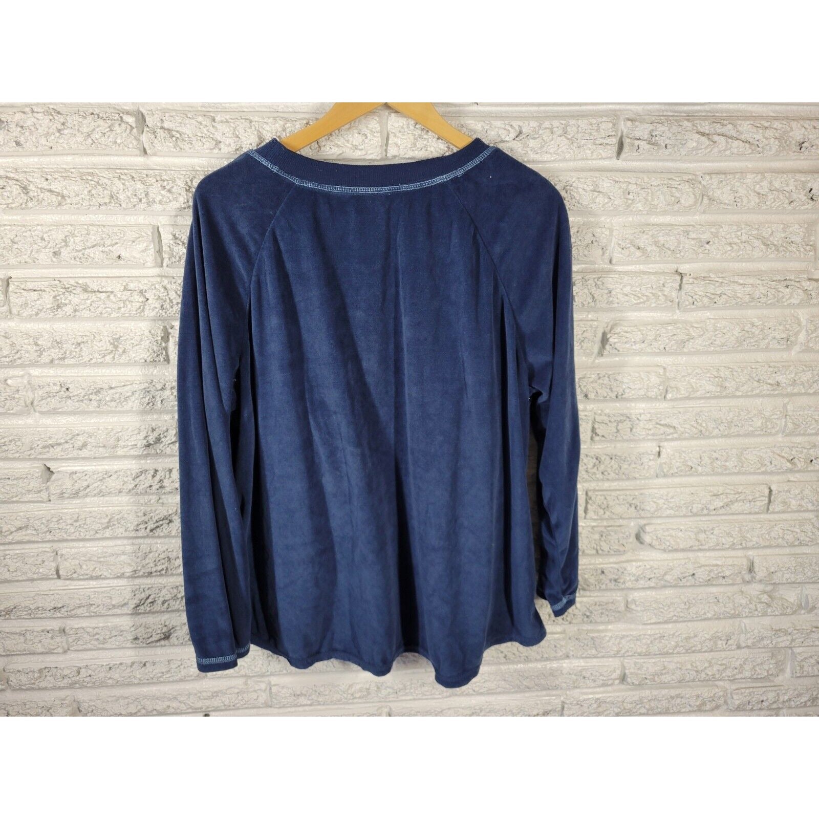 This cozy and stylish pajama top from Secret Treasures is a must-have for any woman who loves to sleep comfortably and in style. Made from soft polyester fleece, it features a round neckline and long sleeves for ultimate warmth during colder seasons. The blue color gives it a calming and soothing vibe, perfect for a good night's sleep.   The top is adorned with glitter and embroidered accents, adding a touch of glamour to your nighttime routine. It's machine washable for easy care and available in size 2X, perfect for plus-size women. Get ready to snuggle up and drift off into dreamland with this amazing pajama top.
