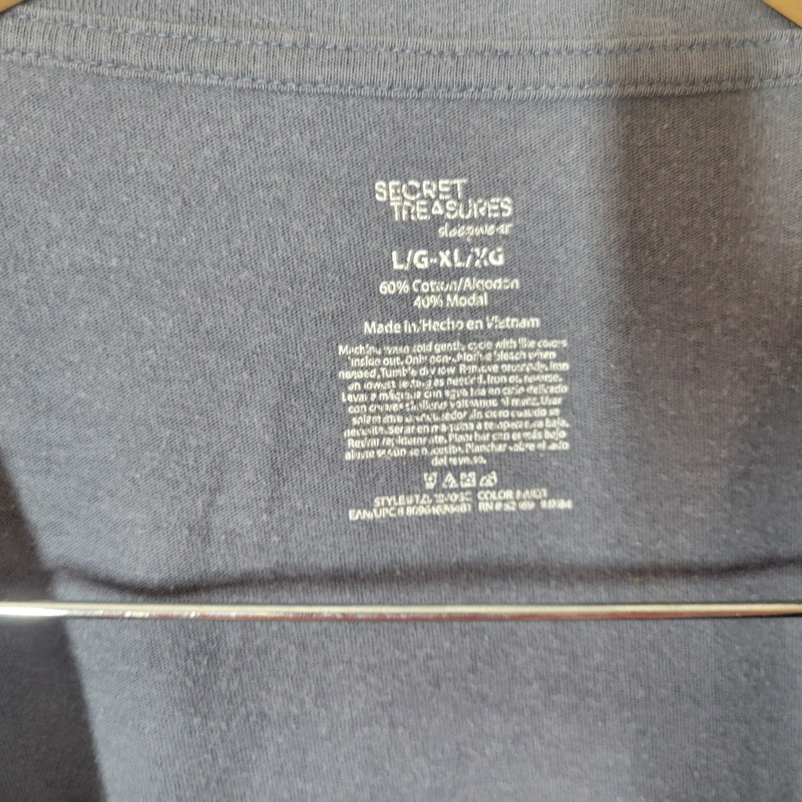 The Secret Treasures Women's Pajama Top in size L/XL is a stylish and comfortable addition to any sleepwear collection. Made from a soft cotton blend material, this gray top features a short sleeve design that is perfect for all seasons. The glitter accents add a touch of sparkle to your lounge wear, making it a fun and stylish choice for cozy nights in. Easy to care for with machine washable instructions, this pajama top from the Secret Treasures brand is a must-have for any woman looking to make today amazing.