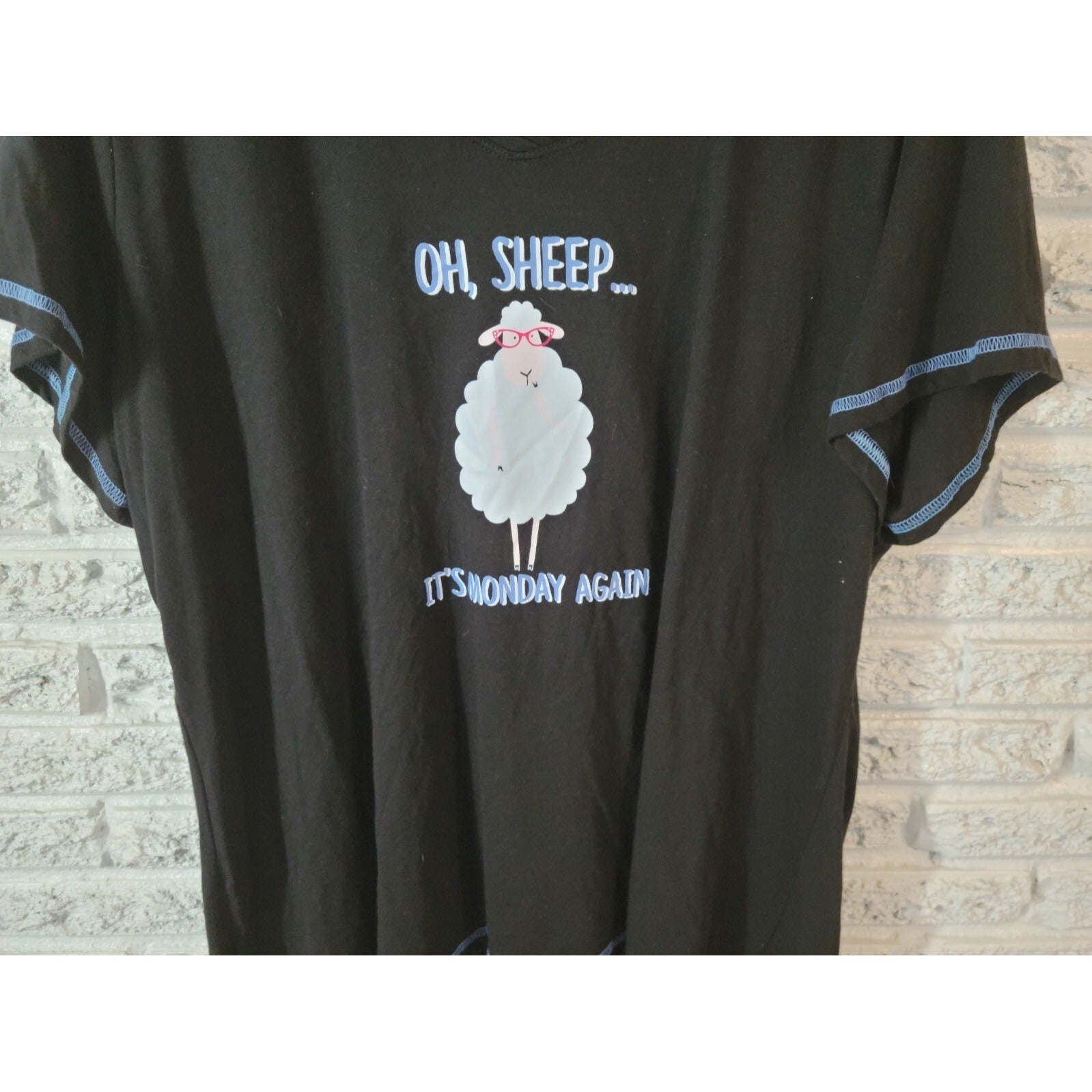 Elevate your sleepwear game with this Secret Treasures Women's Top in size 3X. The black V-neck pajama top is made of a cozy cotton blend material that is perfect for all seasons, whether it's winter, summer, fall, or spring. The short-sleeved top is machine washable for easy care, and features a cute "Oh Sheep, It's Monday" print that will make any day a little better.   This stretchy pajama top is designed for plus size women and is perfect for lounging around the house or getting a good night's sleep. Add this comfortable and stylish top to your sleepwear collection today!