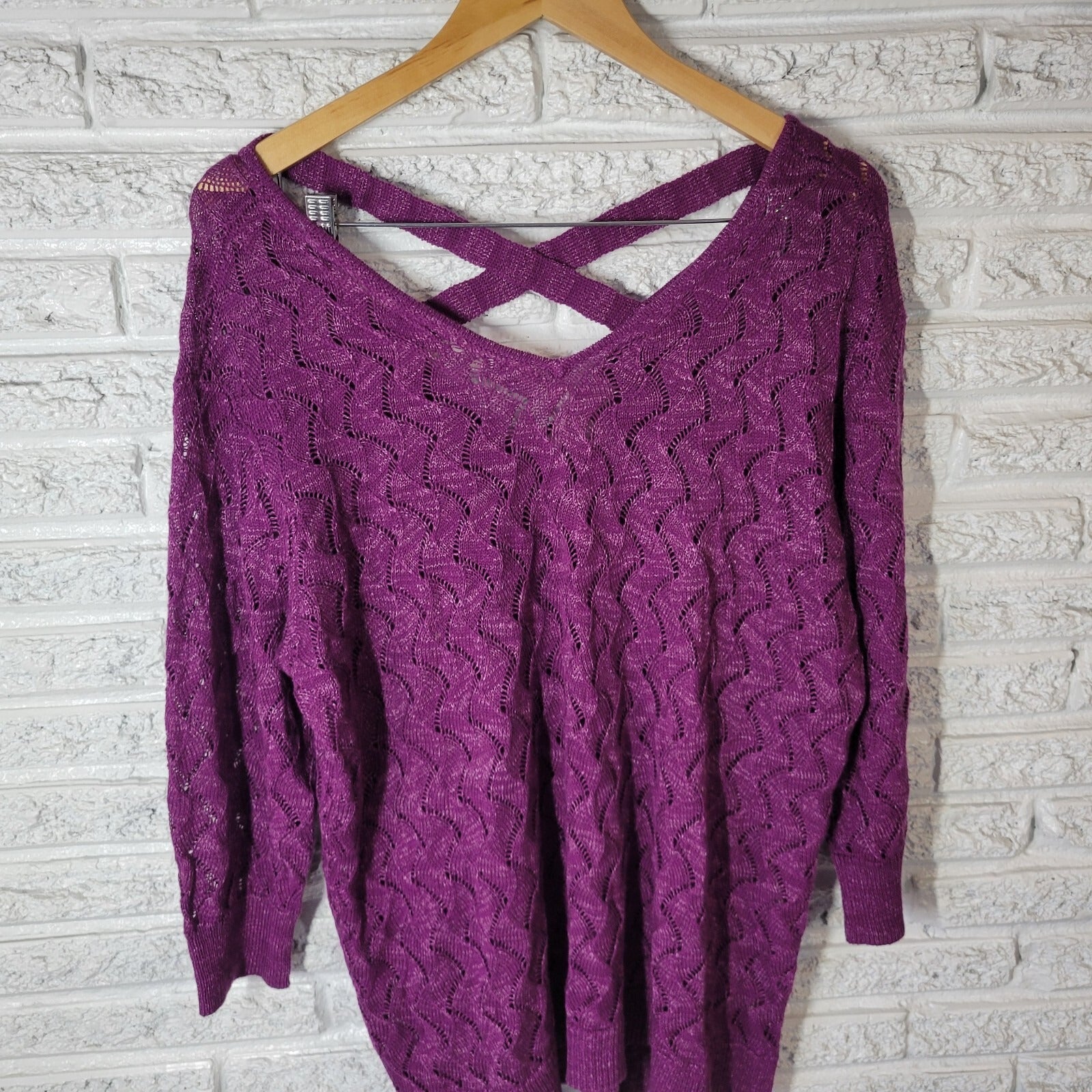 Sejour Womens Sweater 1X Plus Purple Soft Cotton Blend Lightweight Lattice Back
