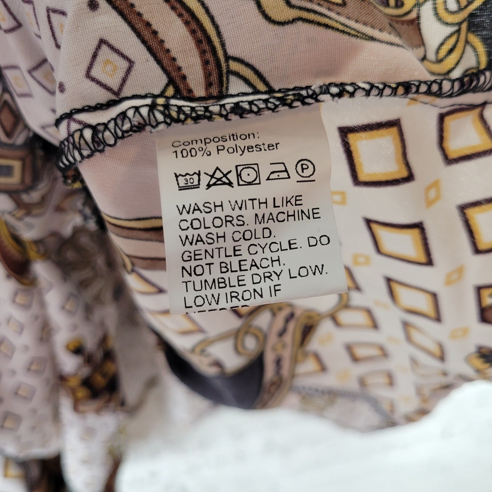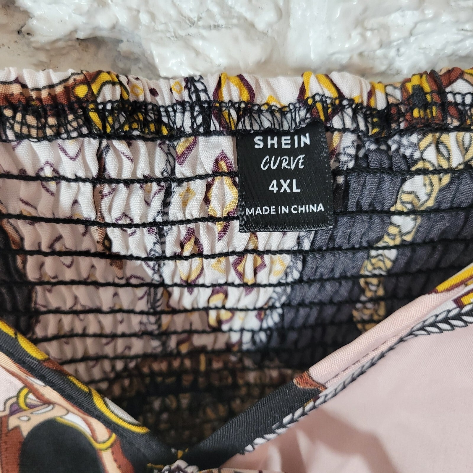The Shein Curve Women's Top in 4XL Plus size is a stylish and comfortable swing camisole with a geometric pattern in black and gold. This sleeveless top features a V-neck and adjustable spaghetti straps, making it perfect for casual or travel occasions. Made from lightweight polyester material, this camisole is easy to care for with machine washable instructions. Perfect for all seasons, this SheIn camisole offers a regular fit and plus-size options, catering to women looking for a chic and versatile addition to their wardrobe.