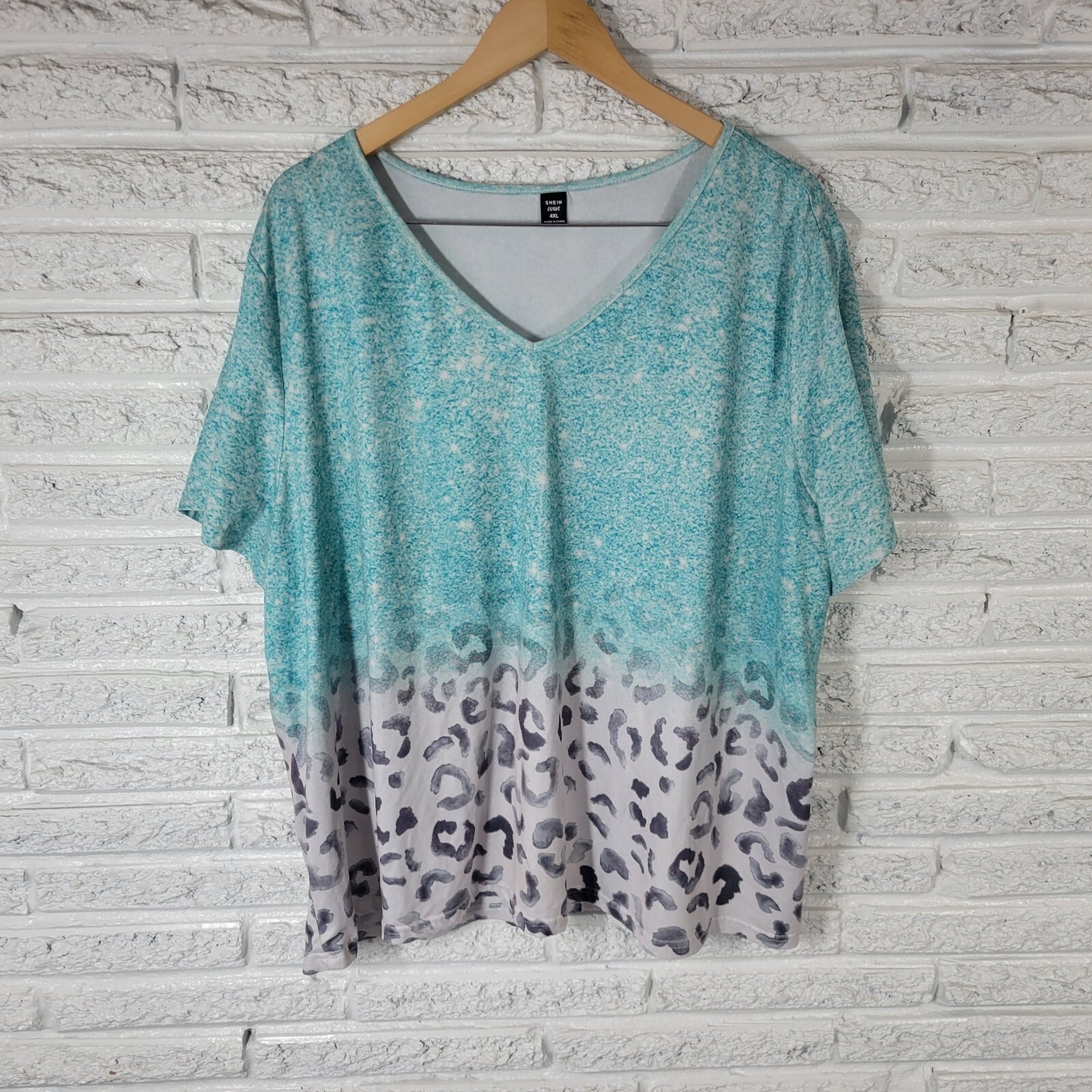 Shein Curve Womens Top 4XL Plus Tee Short Sleeve Blue Animal Print Poly Blend
