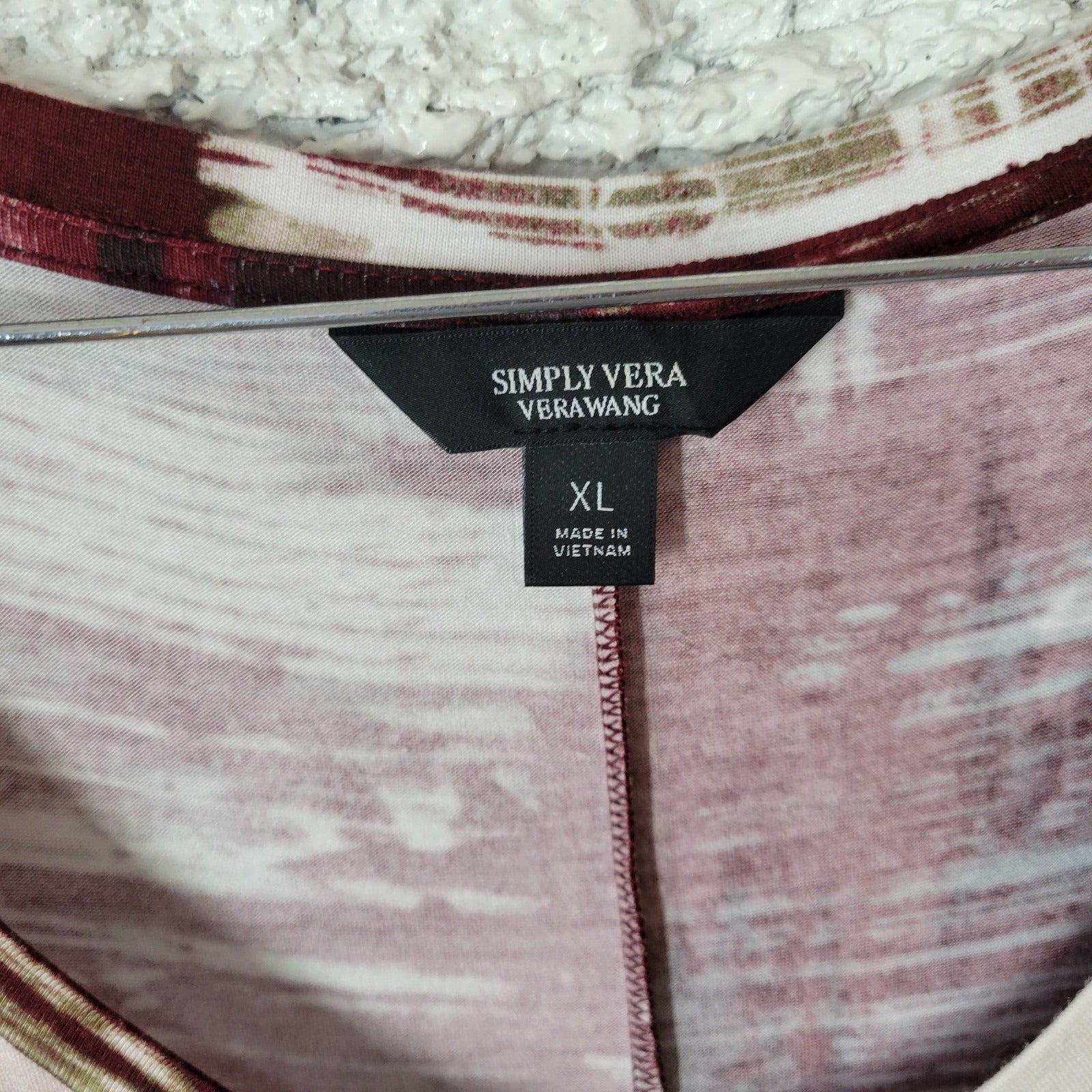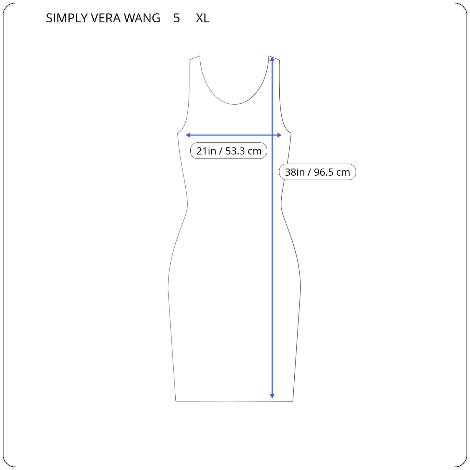 The Simply Vera Wang Women's Dress in XL size features a stylish tank top design with a chiffon hem in burgundy watercolor. This sleeveless dress has a round neckline and a pullover closure, making it perfect for travel and casual occasions. Made from a blend of spandex and rayon, the dress offers a stretch fit for comfort. The hi-low dress length and machine washable care instructions add convenience to the overall garment.