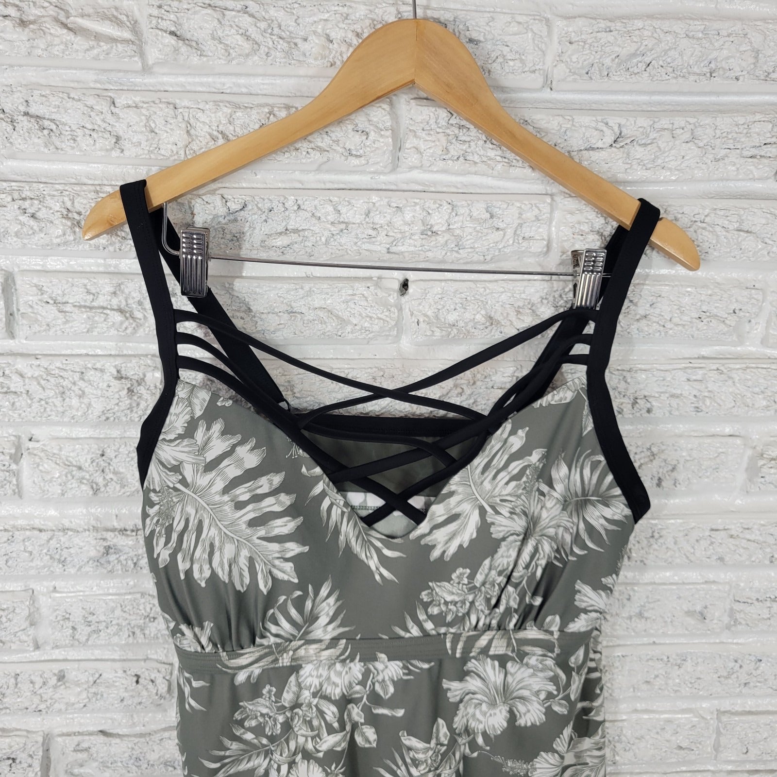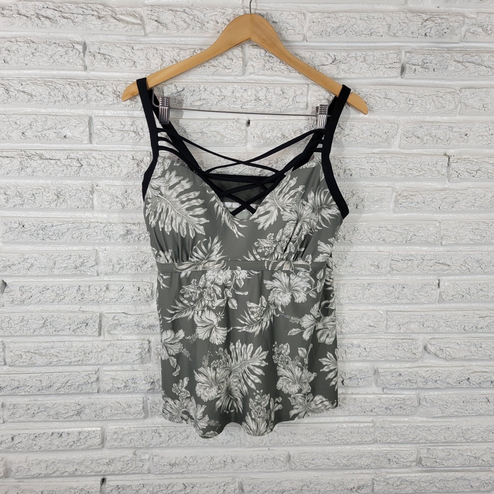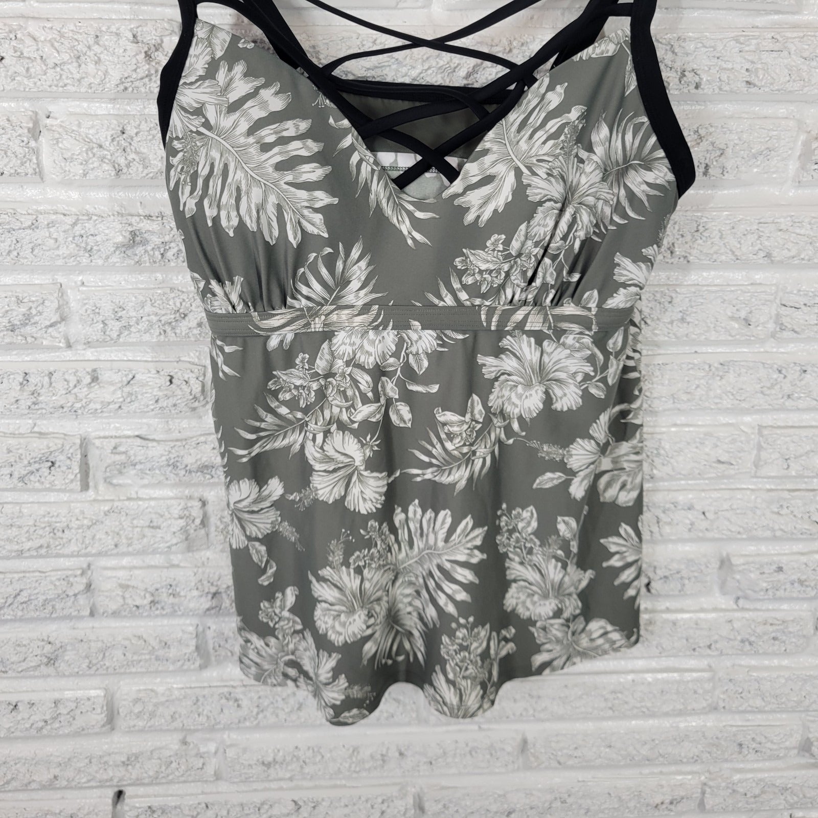 Skye Womens Swim Top 1X Plus Bra Gray GreenFloral Adjustable Straps Lattice Neck
