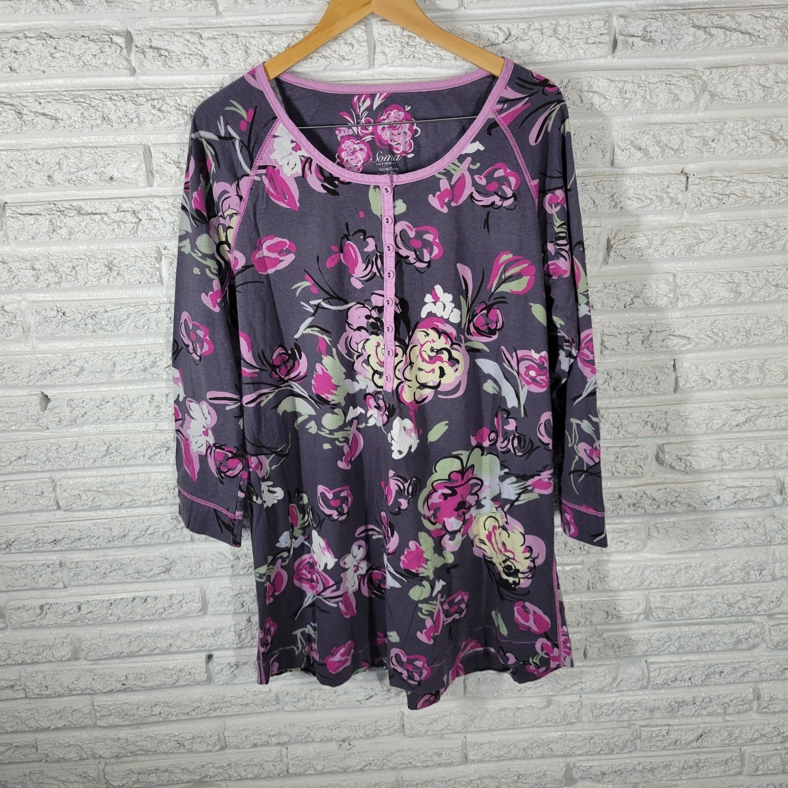 Soma Womens Pajama Top Extra Large 3/4 Sleeve Cotton Gray Lavender Floral Button