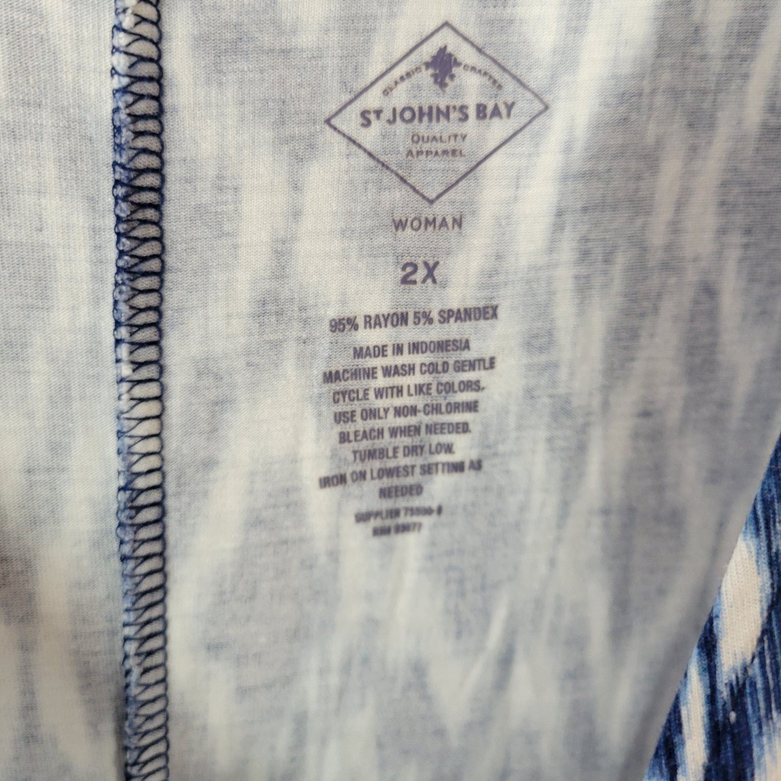 The St Johns Bay Women's Dress in 2X Plus size is a stylish and comfortable option for casual occasions. This blue tank dress features a geometric watercolor design of blue diamonds, perfect for adding a fun and chic touch to your wardrobe. Made from a blend of spandex and rayon, the dress offers stretch for a comfortable fit. With a V-neckline and pullover closure, this dress is easy to wear and easy to care for with machine washable fabric. Ideal for all seasons, this mini dress from ST JOHN'S BAY is a versatile and trendy choice for women of all shapes and sizes.