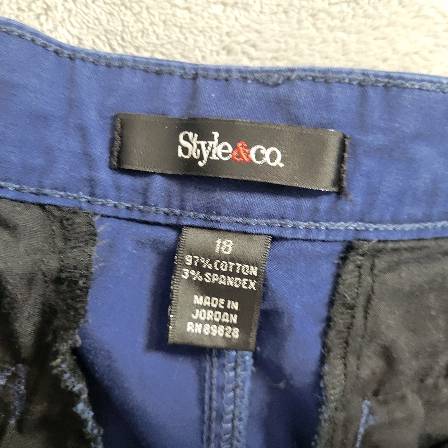 These Style & Co. women's Bermuda shorts offer a classic, versatile look in a rich navy blue color perfect for any casual or semi-casual occasion. Crafted from a breathable blend of 97% cotton and 3% spandex, these shorts provide a comfortable fit with just the right amount of stretch for ease of movement. The size 18 fit is tailored to flatter, featuring a mid-rise waist with belt loops and a button closure for secure wear.Designed with practicality in mind, these shorts have two front slash pockets and two back button-flap pockets, adding functional style without compromising on clean lines. The hem falls just above the knee, making them ideal for spring and summer wear. Their simple design and solid color make them a perfect pairing with a variety of tops and footwear, from casual tees to dressier blouses.