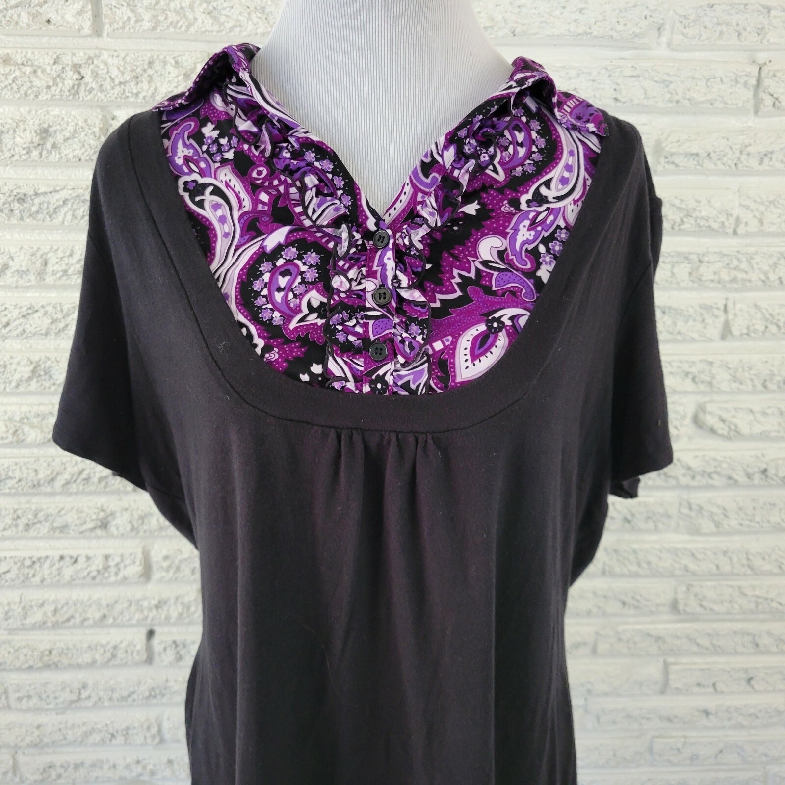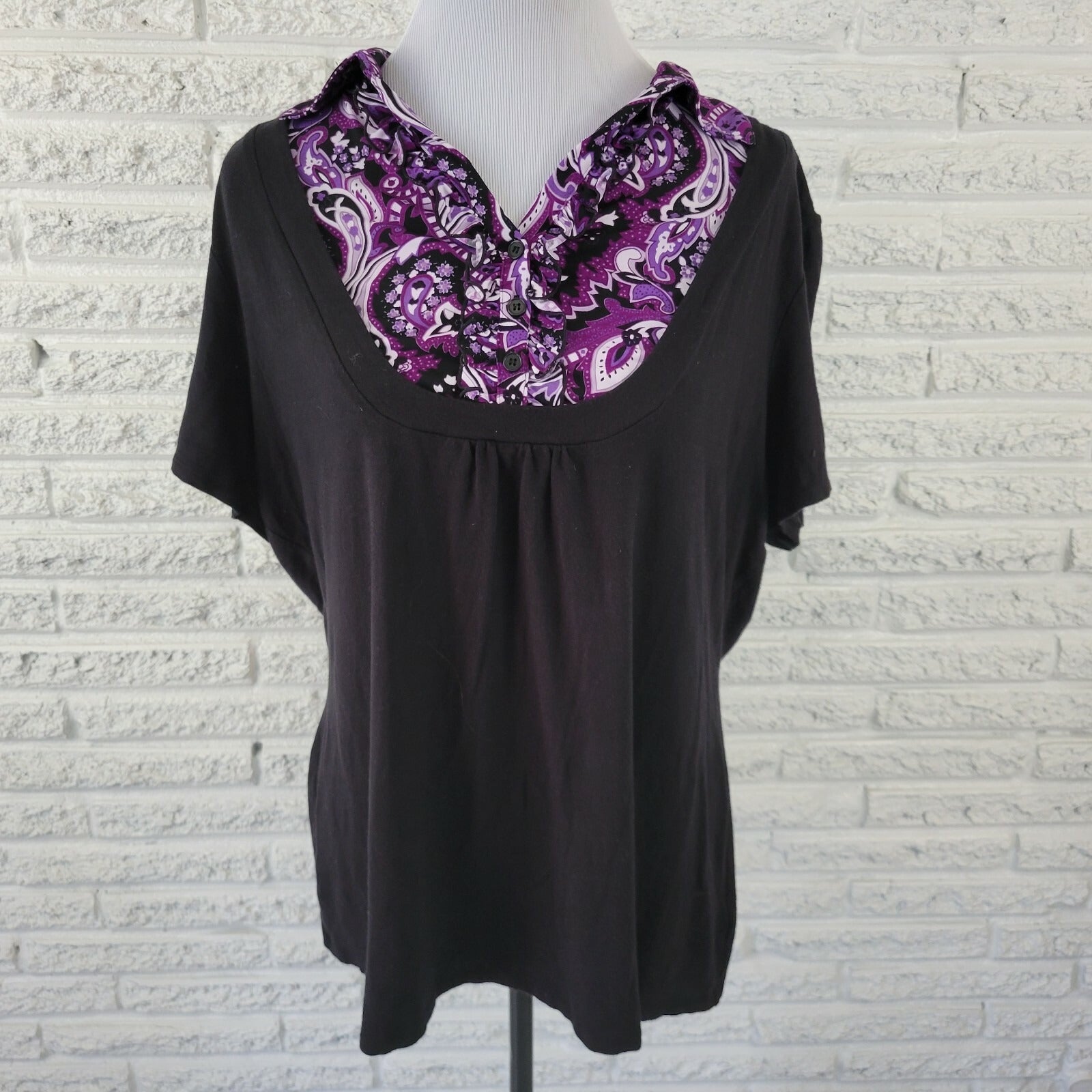 Style & Co Womens Top 2X Plus Short Sleeve Paisley Quarter Button Collar Purple
