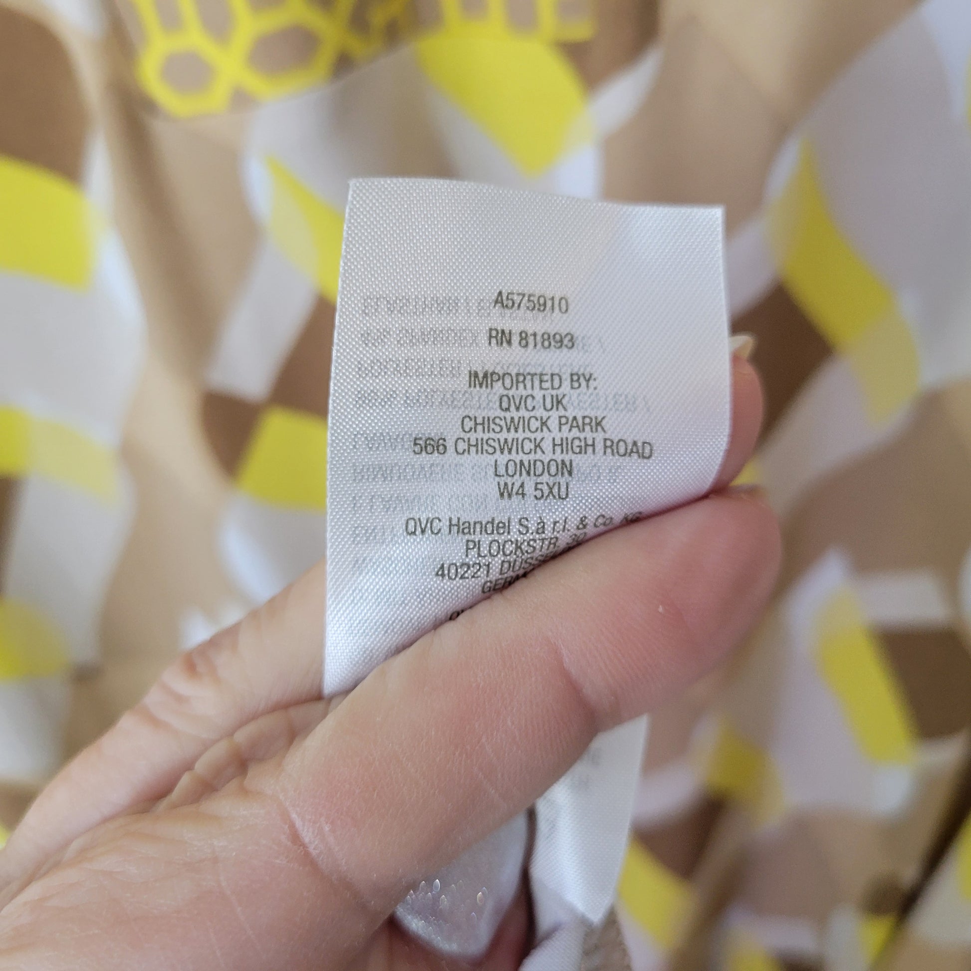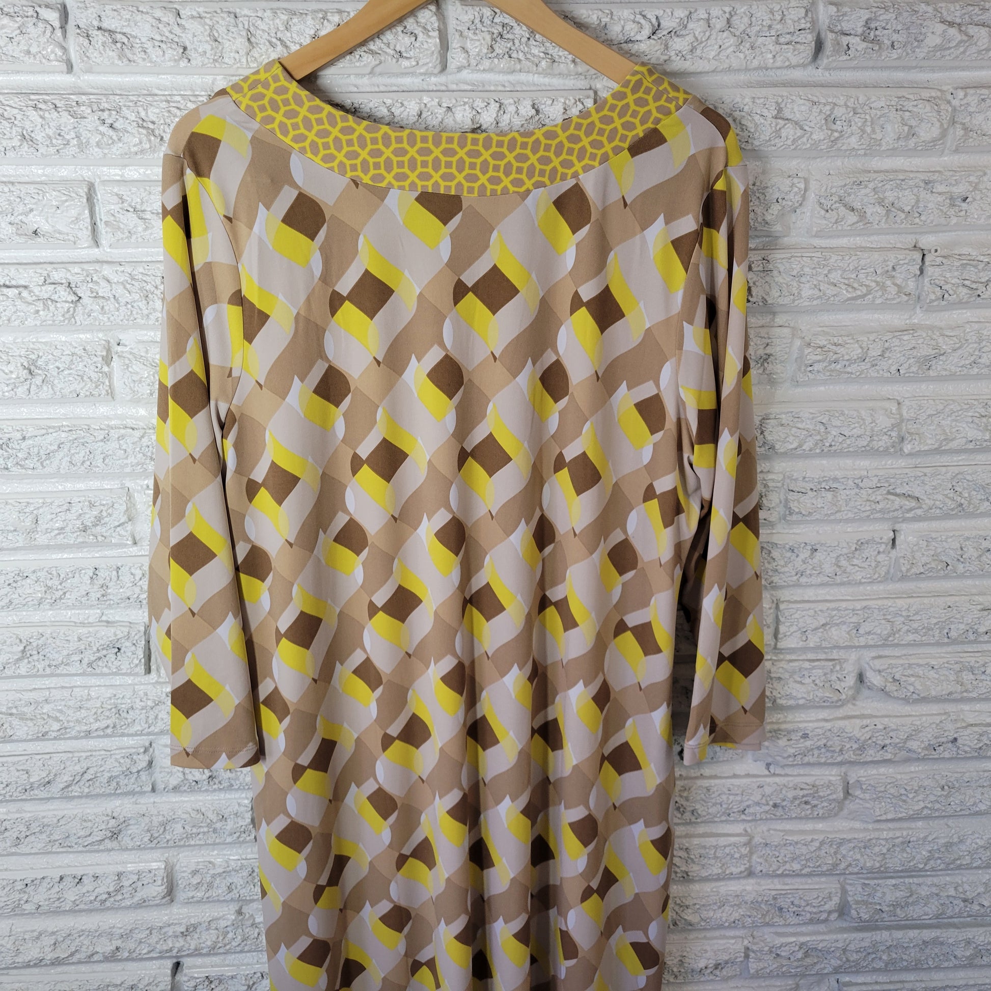Susan Graver 1X Plus Yellow Tan Geometric V-Neck 3/4 Sleeve Dress GEO232E