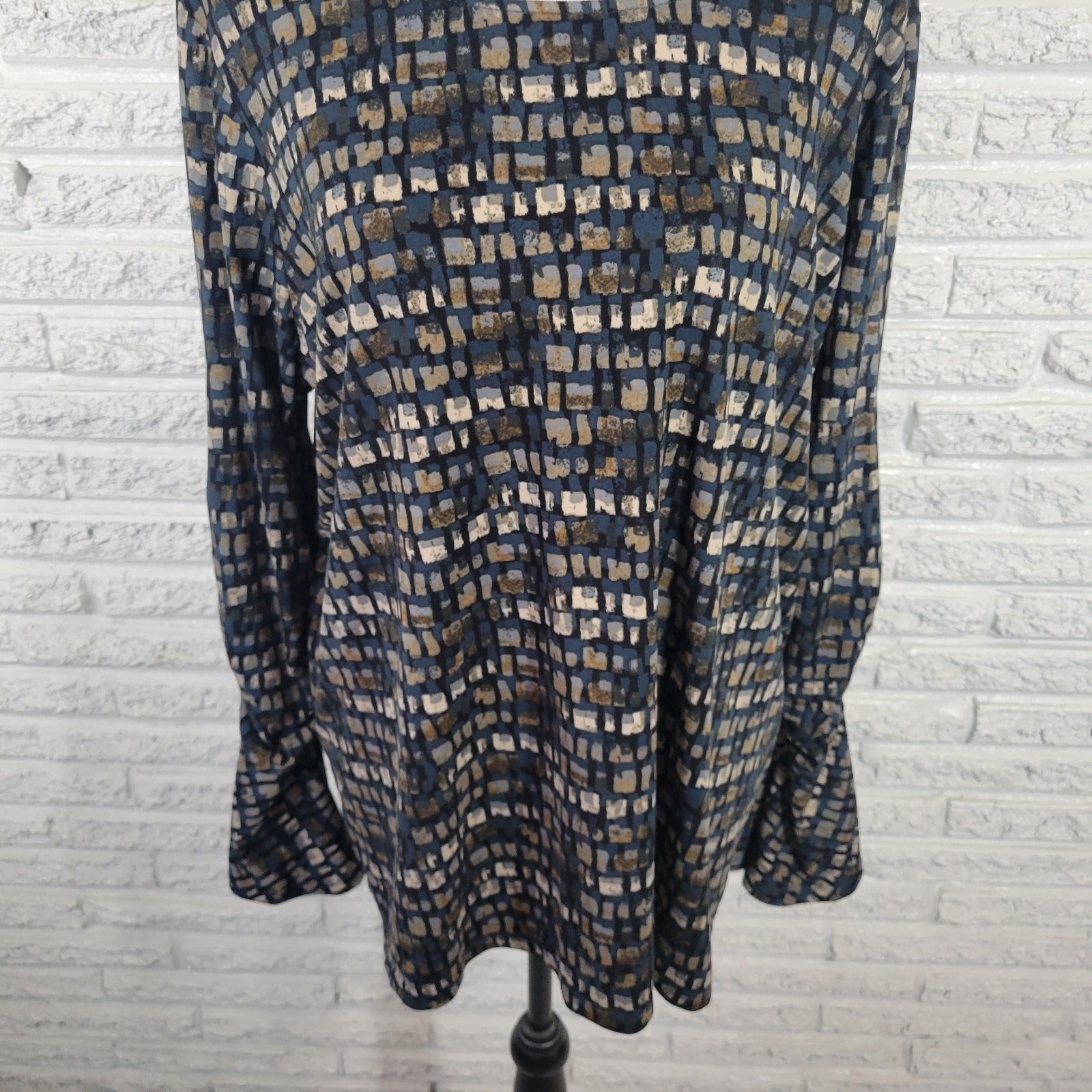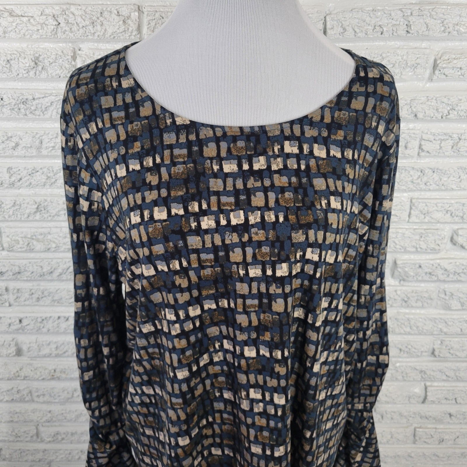 Susan Graver QVC Womens Top XL Ruched Bell Sleeve Blue Geometric Poly Blend