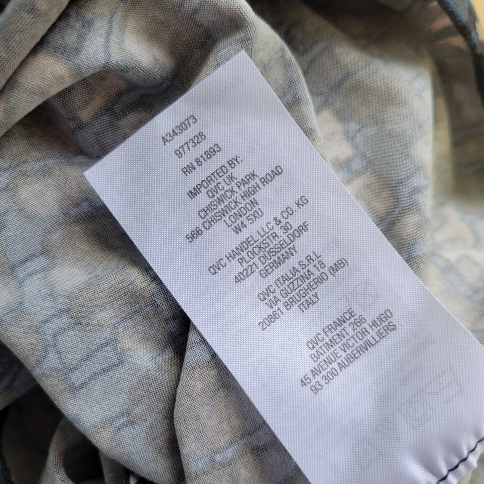 The Susan Graver QVC Women's Top in XL size is a stylish and versatile addition to any wardrobe. This blue/brown geometric blouse features ruched bell sleeves, a round neckline, and a pullover closure for easy wear. Made from a comfortable polyester blend, the top is machine washable and suitable for all seasons. The regular fit and stretch material ensure a flattering and comfortable silhouette, perfect for travel or casual occasions. Ideal for women who appreciate quality and style.