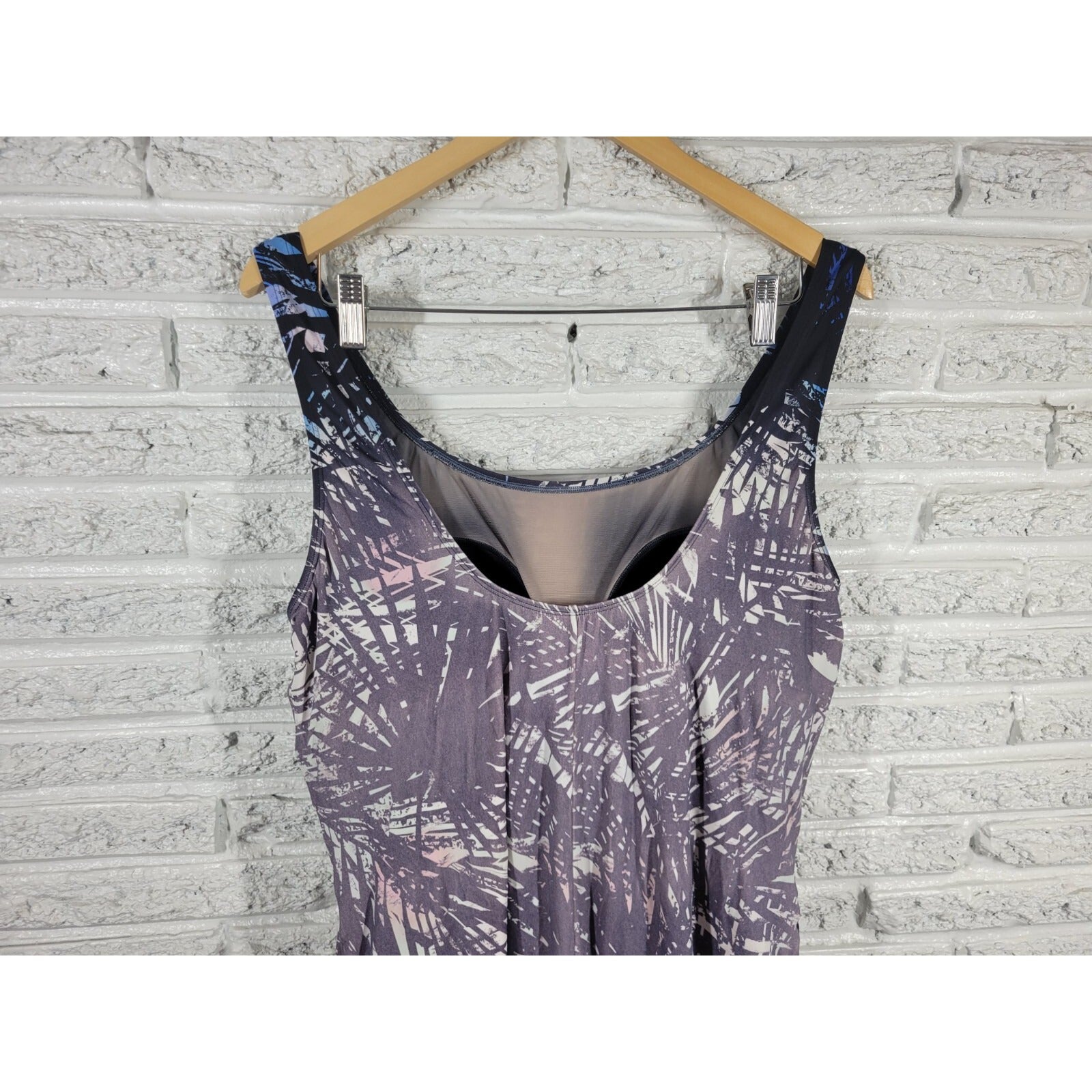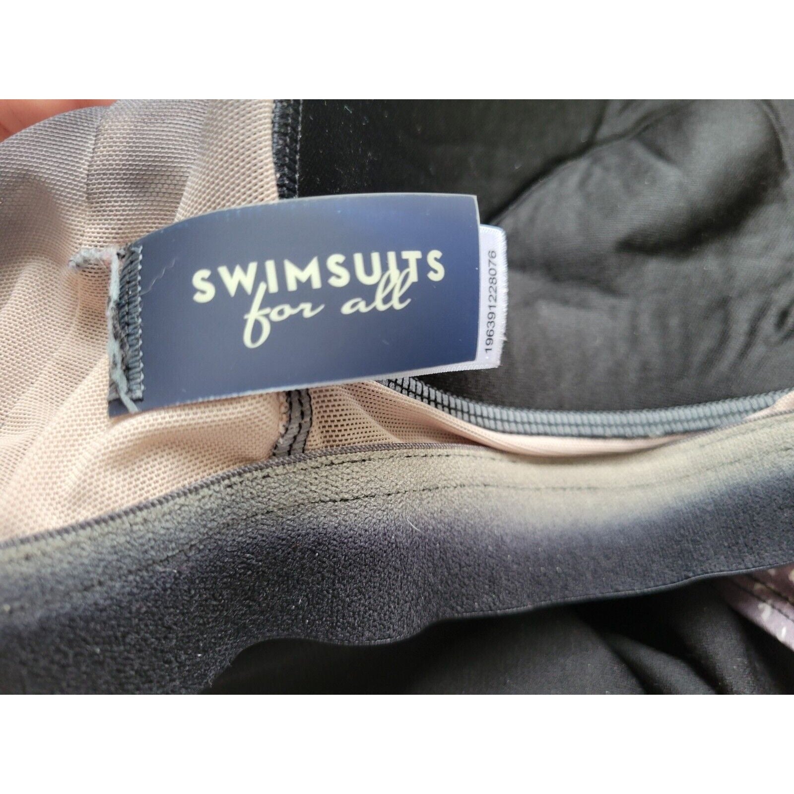 This product is a gray one-piece swimsuit for plus-size women, made of nylon and spandex. It features a built-in bra, stretchy material, and is lined for comfort. The swimsuit is designed by Swimsuits For All and has a bleached watercolor look. It is recommended to be hand washed only and was manufactured in Vietnam.