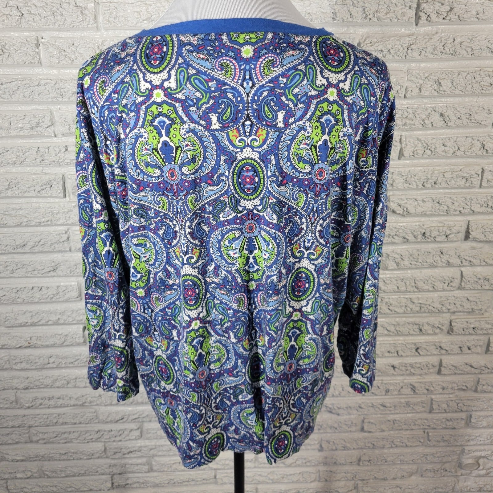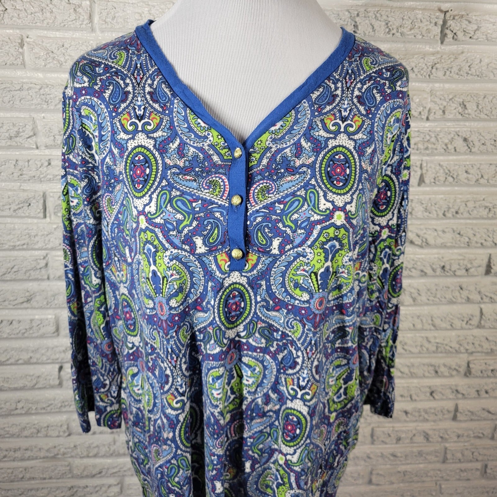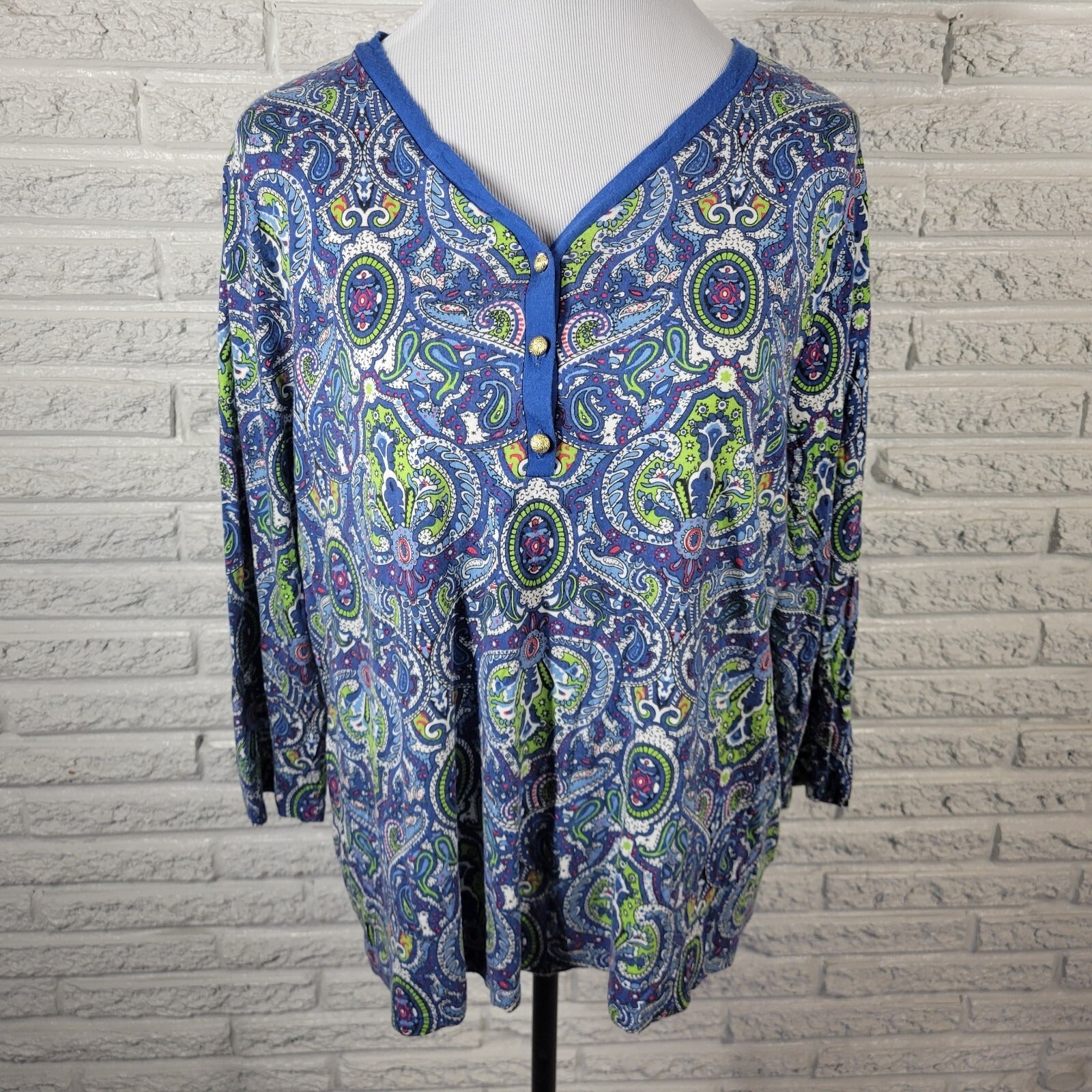 Talbots Womens Top 2X Plus 3/4 Sleeve Blue Green Paisley Comfy Quarter Button