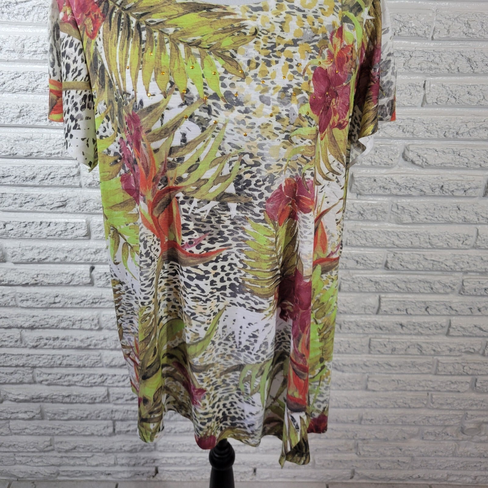 This Terra & Sky women's tee is a must-have addition to your wardrobe. The green/red floral pattern adds a touch of femininity, while the studded accents give it a trendy edge. The short sleeves and round neckline make it perfect for both travel and casual occasions. Made of lightweight polyester material, this tee is perfect for all seasons. The split hem adds a unique touch, and the regular fit ensures comfort. Machine washable for easy care, this plus-size tee is suitable for women who wear 1X. Don't miss out on this versatile and stylish piece!
