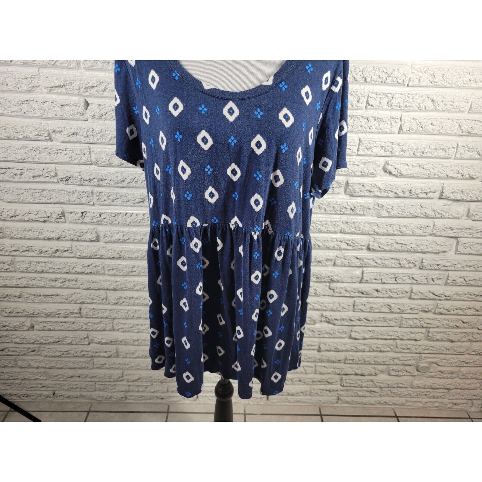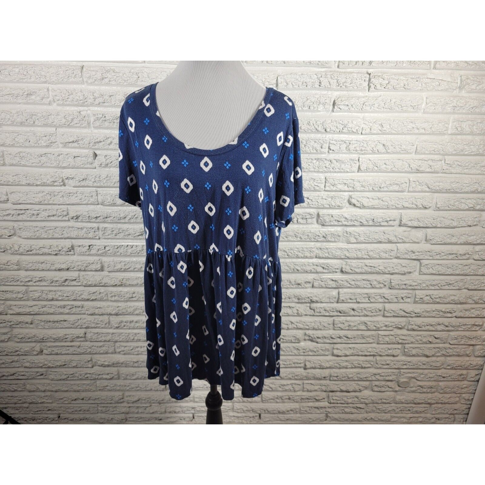 Terra & Sky Women's Top is a casual, geometric patterned blouse made of a blend of rayon and spandex. It has a round neckline, short cap sleeves, and a pullover closure. The top is machine washable and available in size 1X. It features stretch and is suitable for all seasons. The blue diamond patterned top is designed for regular fit and is perfect for women who prefer basic style clothing.