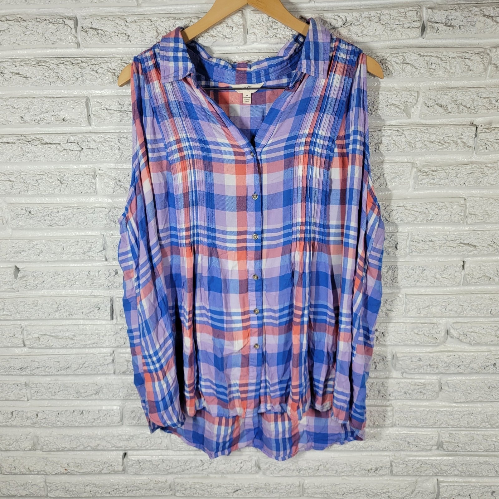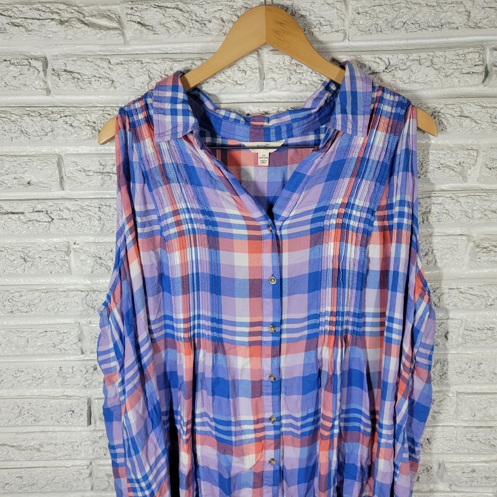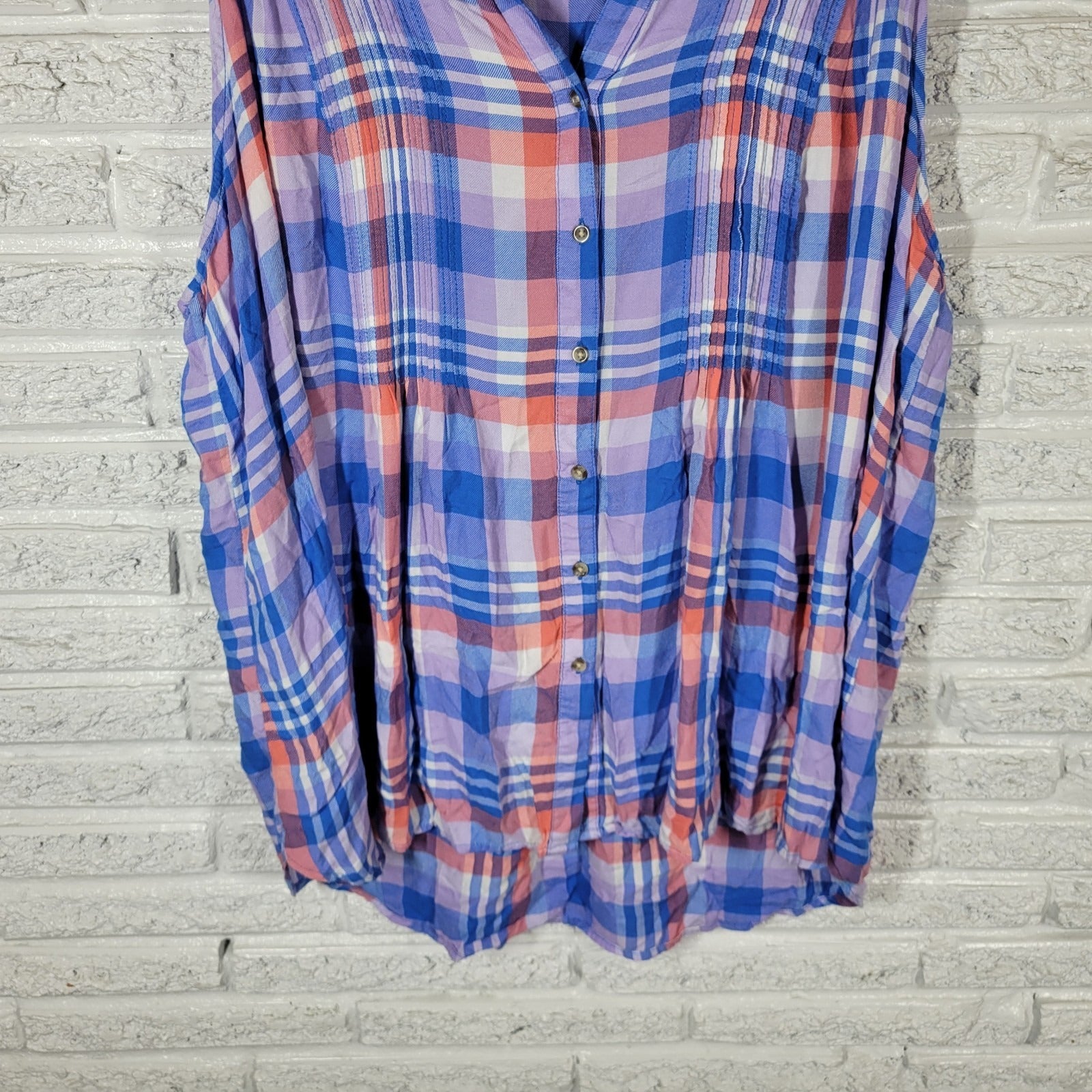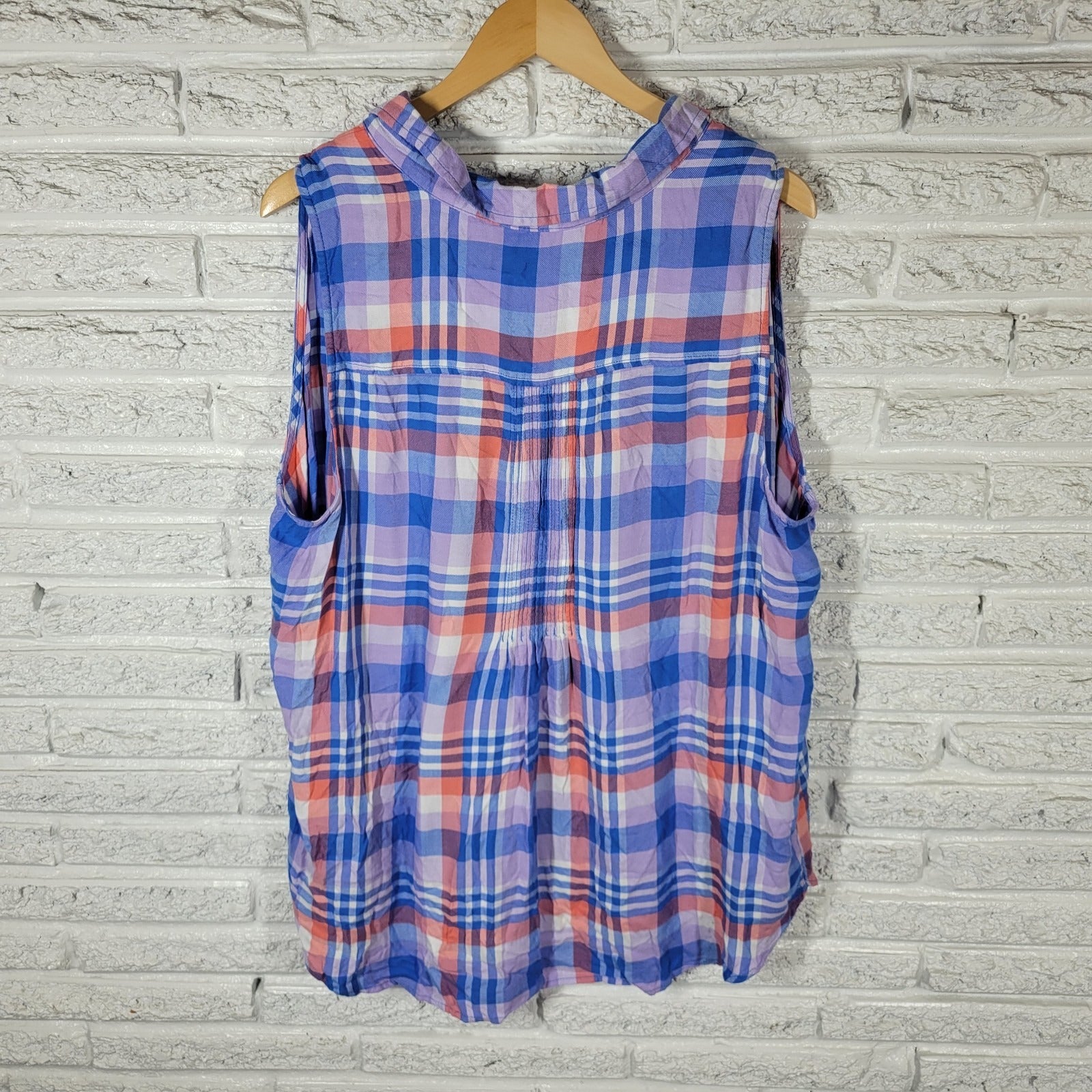 The Terra Sky Women's Top in size 2X Plus is a stylish and versatile addition to any wardrobe. This sleeveless collar button-up in a blue/pink plaid pattern features pleated accents for added detail. Made from lightweight viscose fabric, it can be worn for various occasions such as travel or casual wear. The top is machine washable and perfect for all seasons, making it a practical and fashionable choice for any woman.