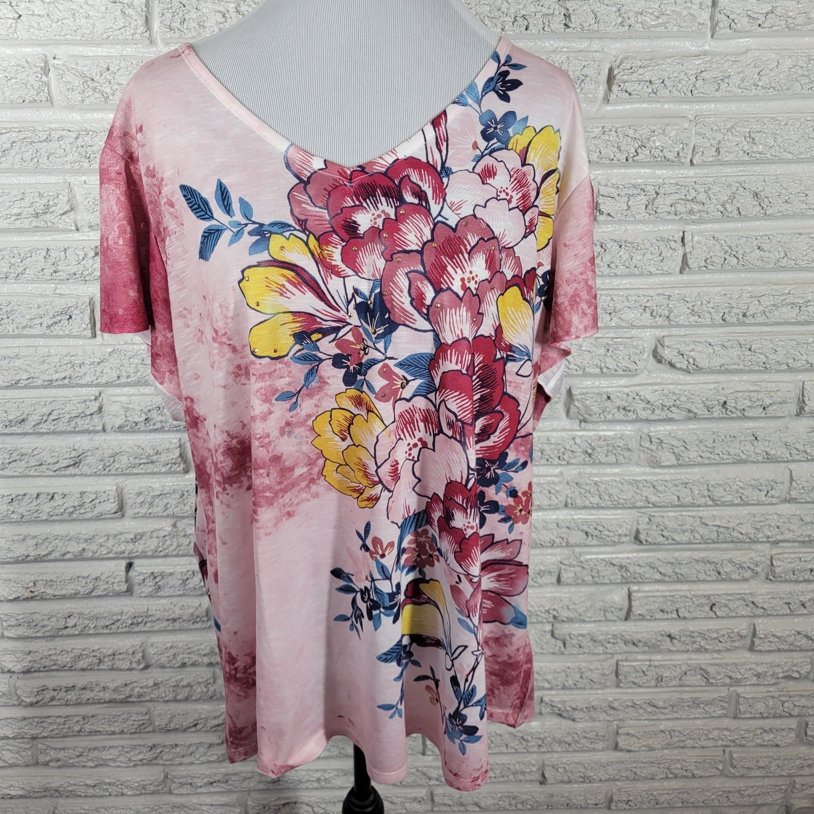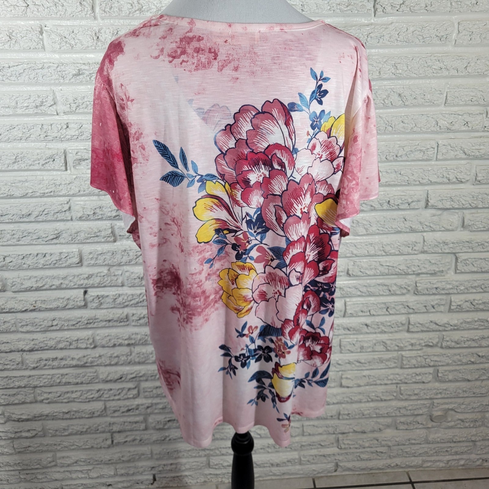 Terra Sky Womens Top 2X Plus Tee Flutter Sleeve Lightweight Pink Floral Studded