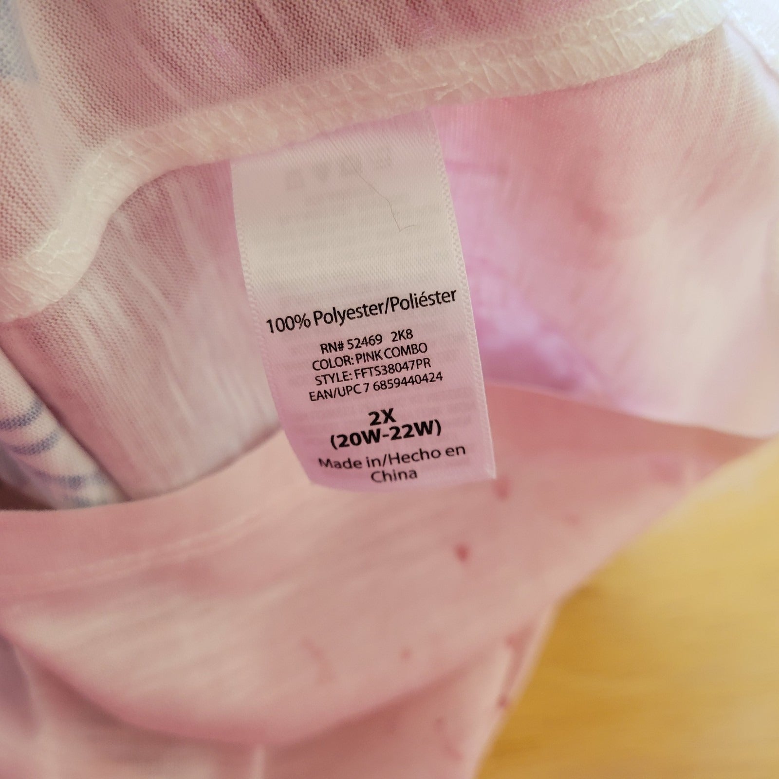 The Terra Sky Women's Top is a stylish and comfortable 2X Plus tee in a beautiful pink/yellow floral pattern with studded accents. This lightweight top features flutter sleeves and a V-neckline, making it perfect for casual or travel occasions. Made of polyester jersey fabric, it offers a regular fit and stretch for all seasons. Easy to care for with machine washable instructions, this tee by TERRA & SKY is a versatile addition to any woman's wardrobe.