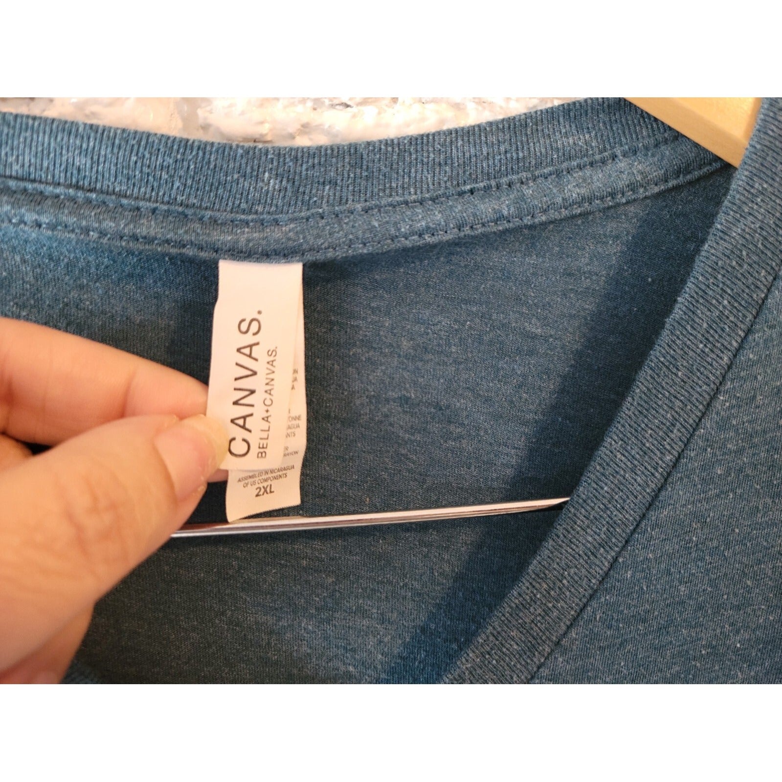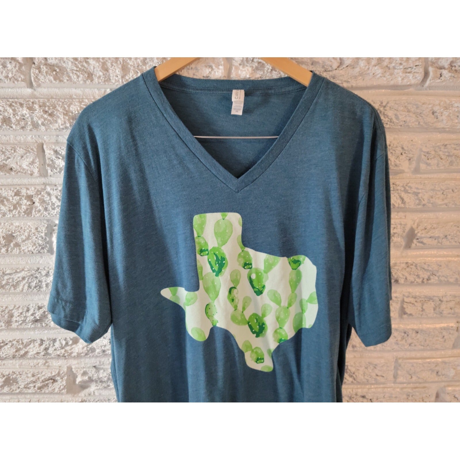 Show off your love for Texas with this blue polyester blend T-shirt featuring a cute cactus design. The V-neck tee is perfect for casual occasions and has short sleeves for a comfortable fit. It is machine washable for easy care and has a pullover closure. This women's top is a regular fit and comes in size 2XL. The jersey fabric type ensures a stretchy and comfortable wear. It is suitable for all seasons and has a casual sleeve type. The canvas brand adds a touch of style to this basic T-shirt. Perfect for plus-size women, this tee is a must-have for any wardrobe.