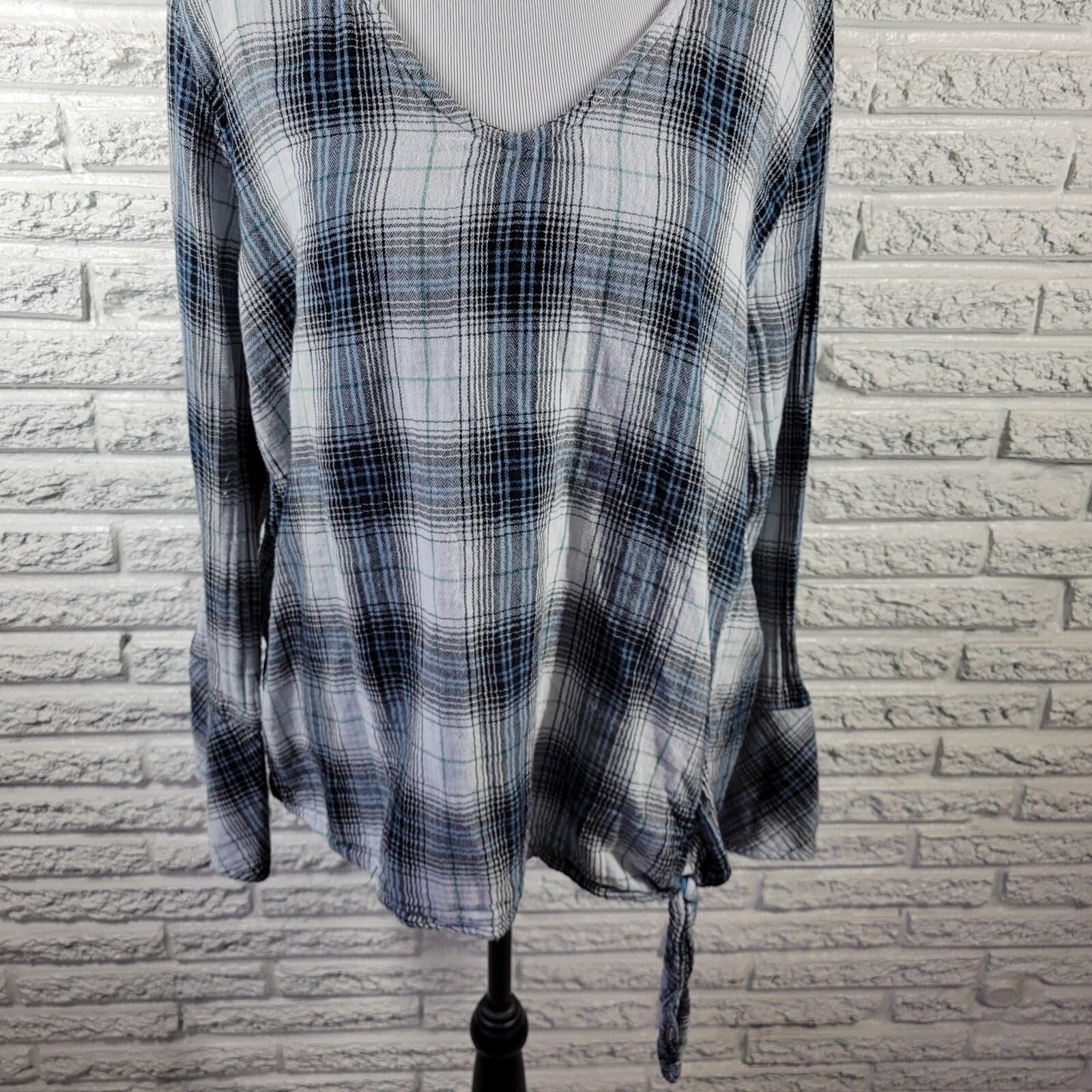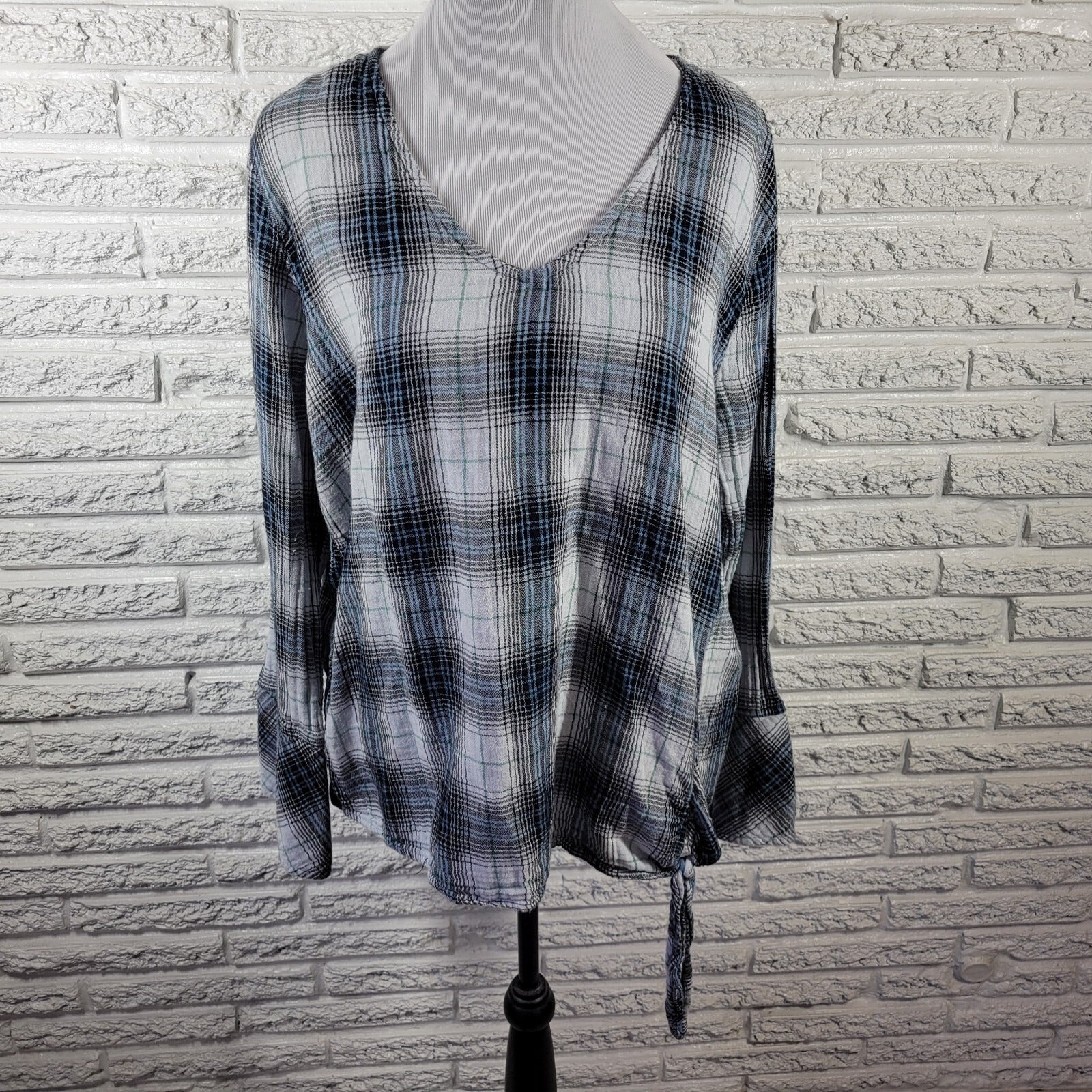 Time Tru Women Top XXL 20 Plus Long Sleeve Gray Blue Plaid Scoop Neck Tied Hem