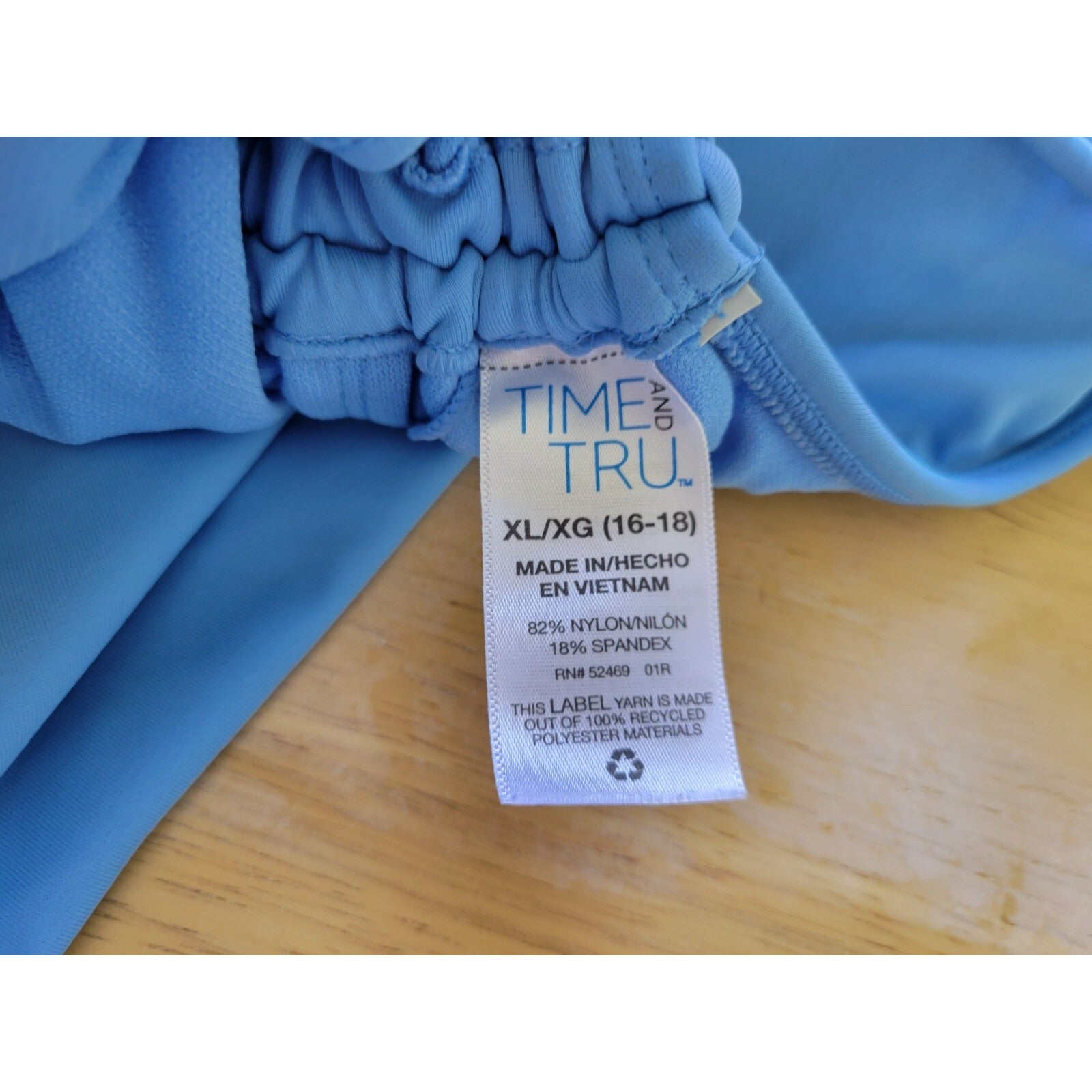 Elevate your swimwear game with this stunning Time And Tru women's swimsuit. This one-piece swimsuit features a beautiful blue color, perfect for a sunny day out at the beach. The spaghetti straps provide a comfortable fit, while the built-in bra offers added support.   Crafted from a blend of nylon and spandex, this swimsuit is machine washable for easy care. The XL size ensures a comfortable fit for women of all shapes and sizes. This swimsuit is perfect for any woman who wants to look and feel her best in the water.