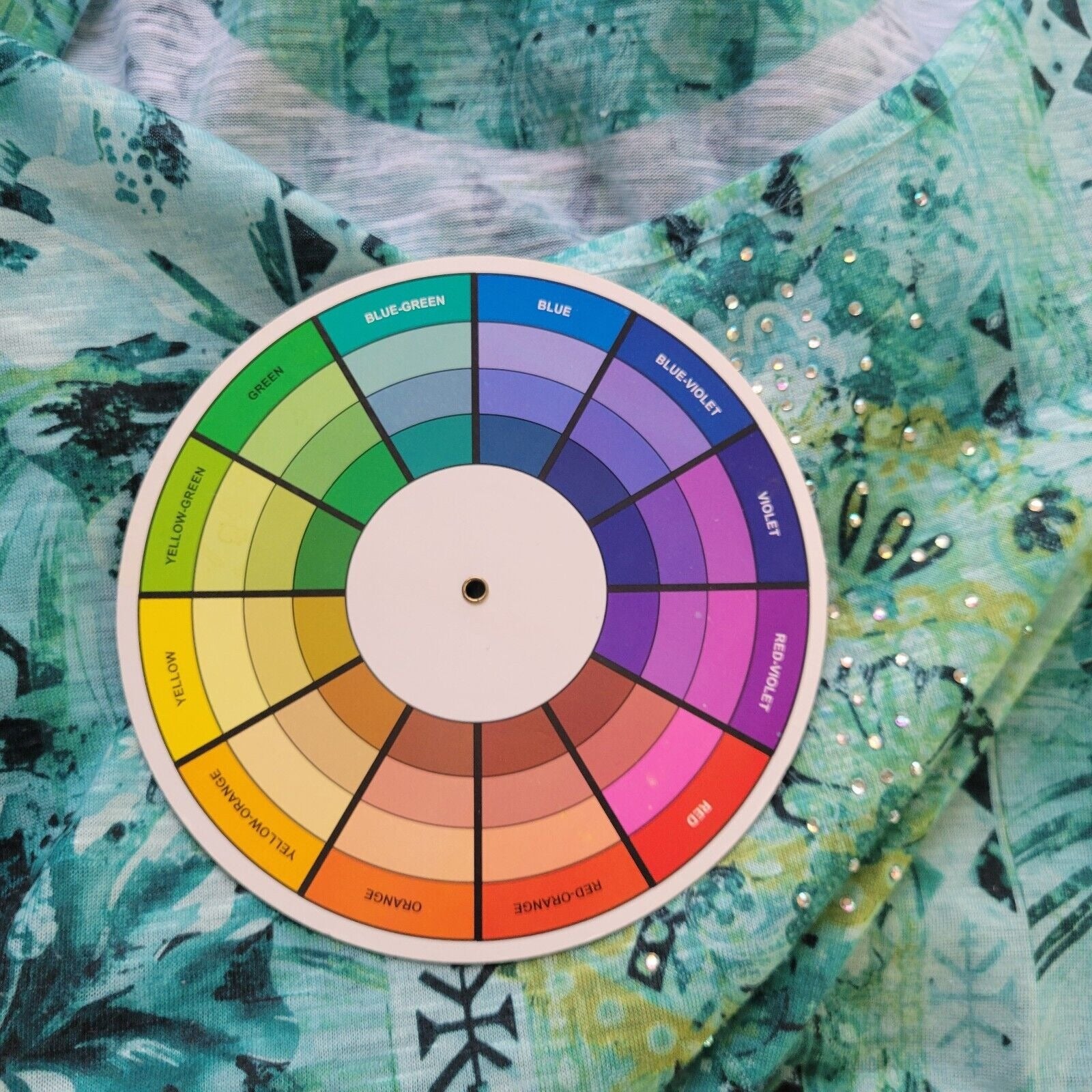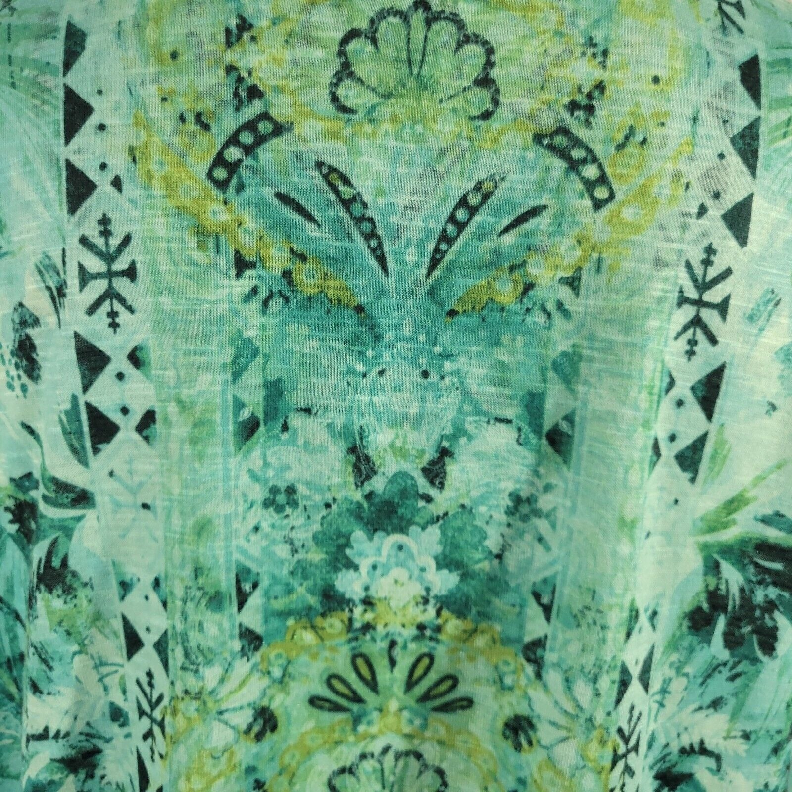 Time Tru Womens Top XL Flutter Sleeve Blue Green Geometric Rhinestones Comfy
