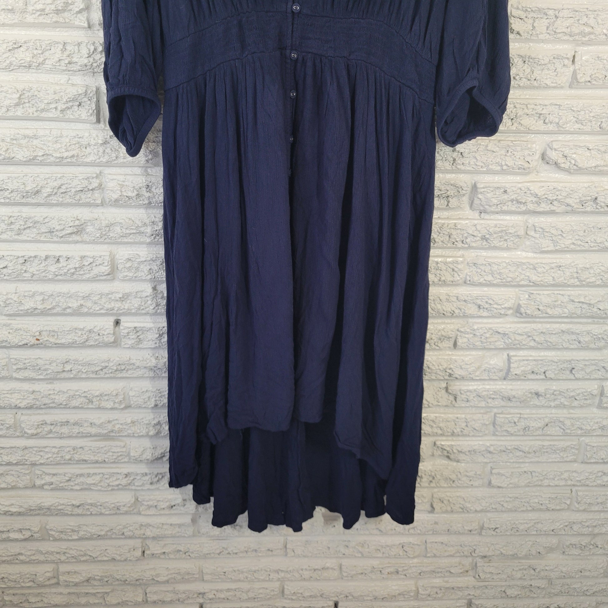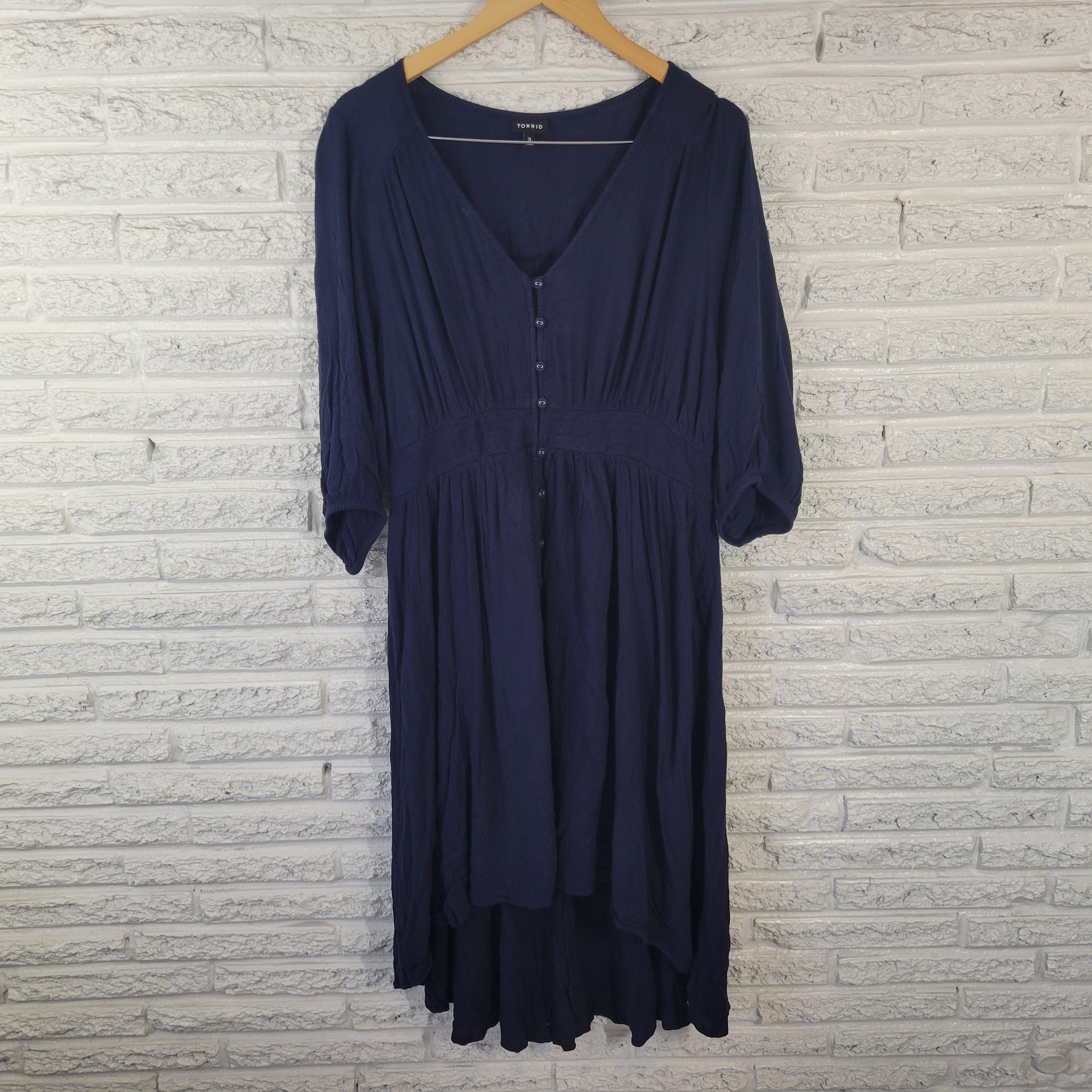 The Torrid Women's Dress in size 3X features a stylish and versatile design with 3/4 sleeves, a V-neckline, and a button closure. Made from rayon fabric, this high-low dress is perfect for travel and casual occasions. The dress is lined and offers stretch for added comfort and style. With a beautiful solid blue color, this mini shirt dress is a must-have for any woman's wardrobe, suitable for all seasons.