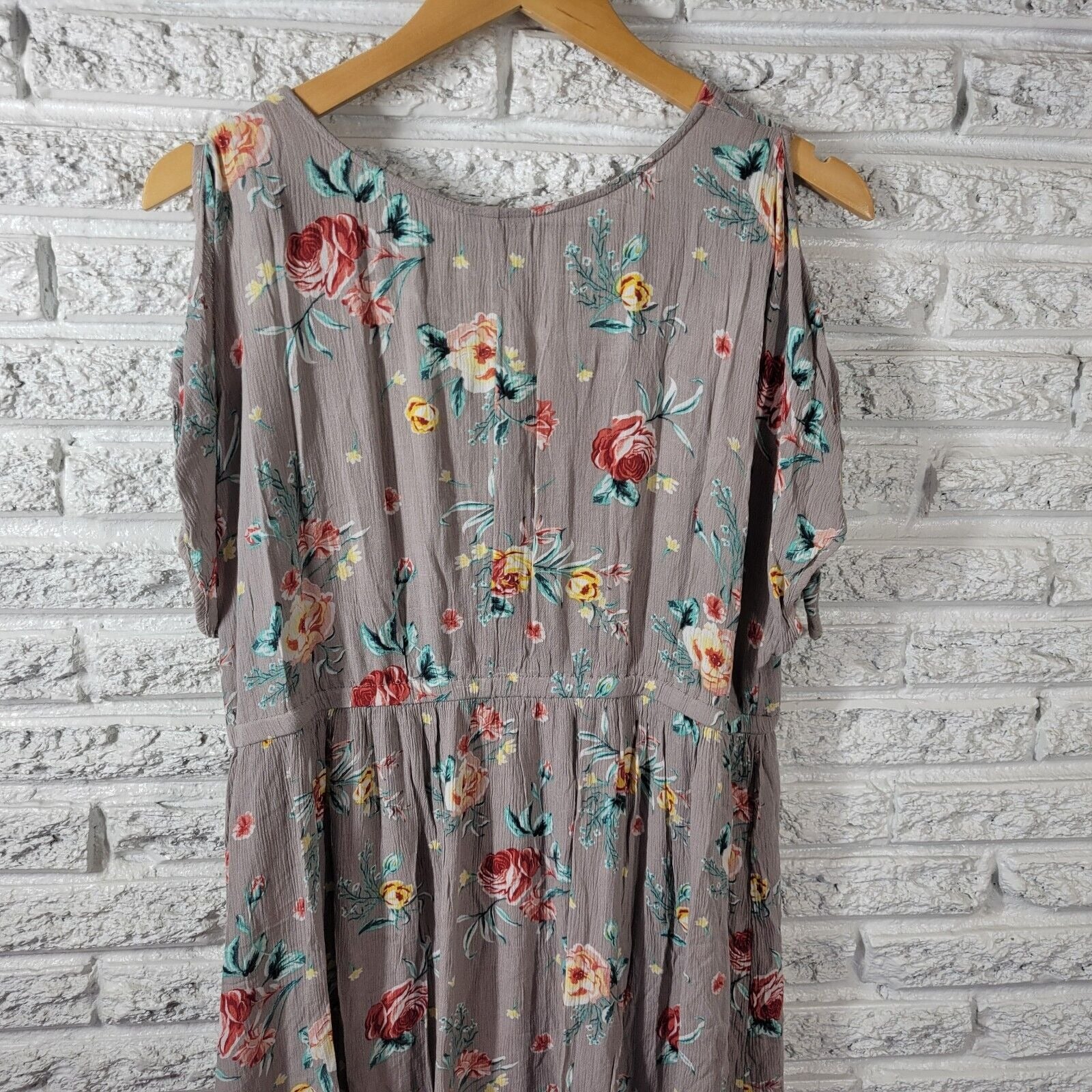 This Torrid dress features a beautiful floral pattern and a V-neckline with a pullover closure. The short cold shoulder sleeves add a touch of elegance to the dress, making it perfect for both casual and travel occasions. The dress is made of lightweight rayon fabric and is dry clean only. It comes in a gray color and has a hi-low dress length. The dress is perfect for plus-sized women, with a size type of Torrid 0X. The dress is suitable for all seasons, including winter, summer, fall, and spring.