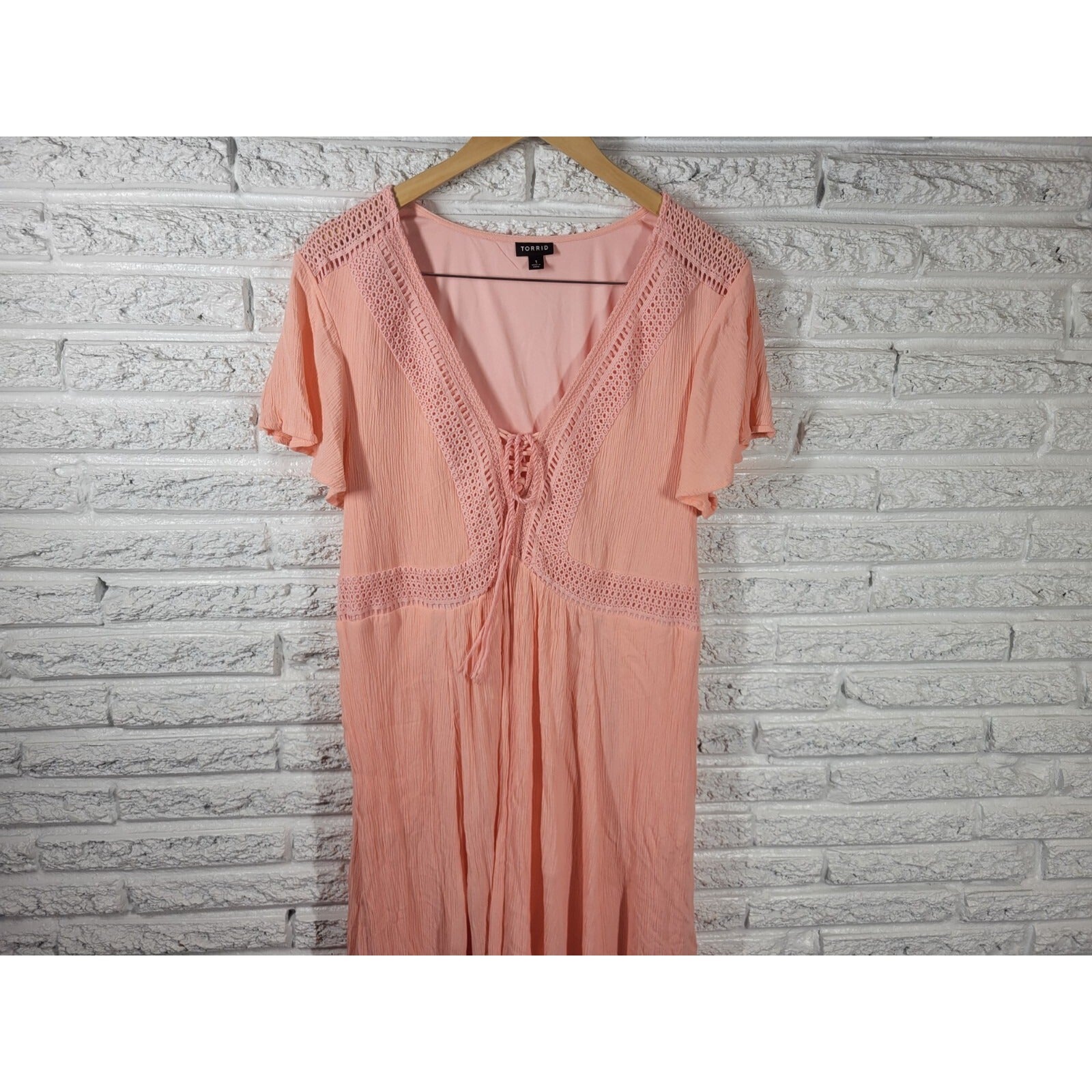 This beautiful Torrid dress is a must-have for any fashion-forward woman. The flutter sleeves and V-neckline add a touch of elegance to the dress, while the lace-up closure and crochet accents give it a unique, playful feel. The dress is made of soft, comfortable rayon material and is fully lined for added comfort and durability.   It's perfect for casual occasions and can be worn in any season, whether you're looking for a winter layering piece or a summer sundress. The dress is available in size 1X and is part of the plus size department. Don't miss out on this stylish and versatile addition to your wardrobe!