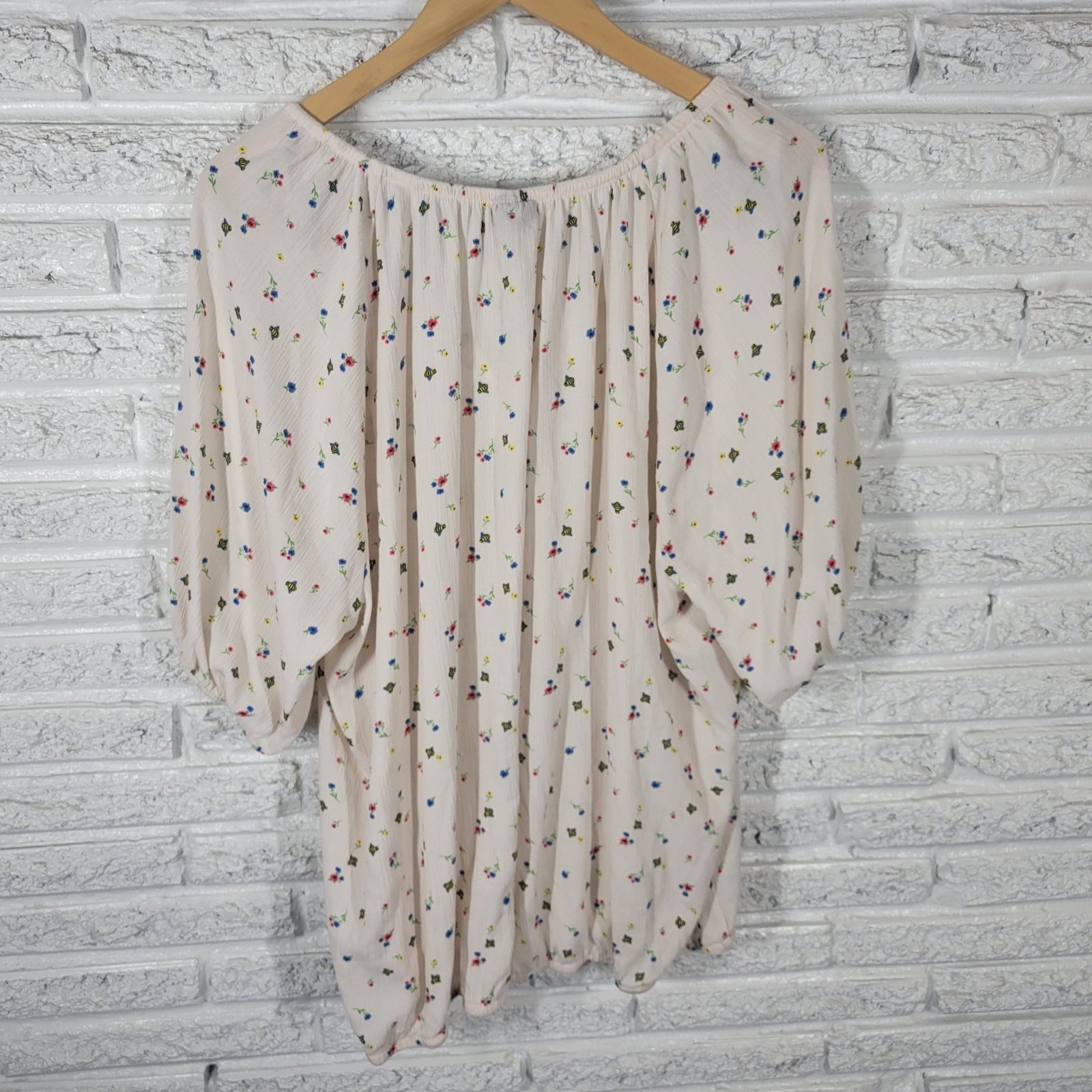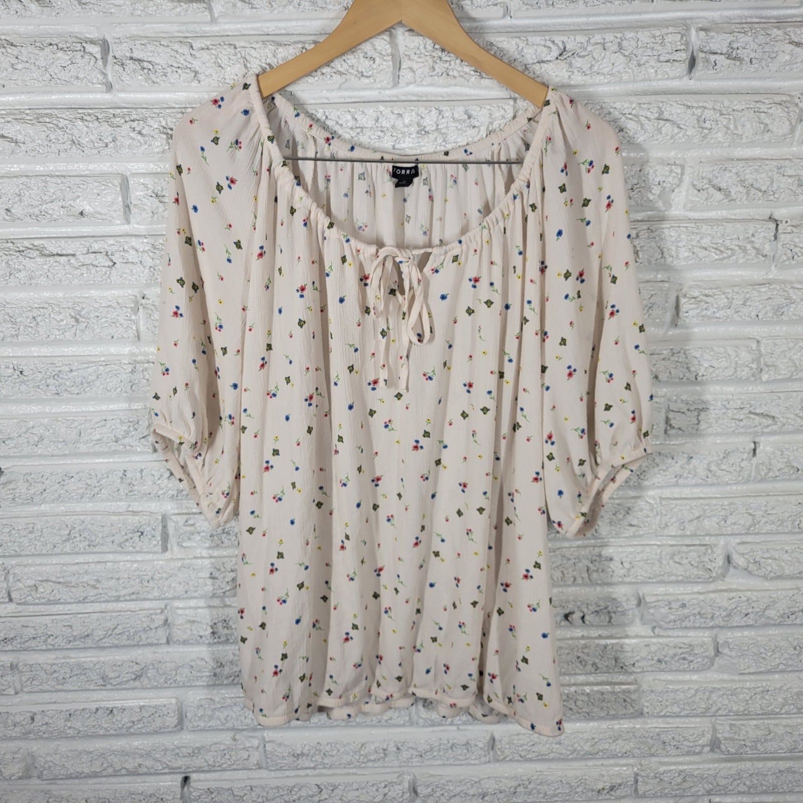 he Torrid Women's Top in size 2X Plus is a stylish and comfortable option for casual wear. Featuring a white and pink floral pattern, this top has short sleeves, a boat neckline, and an elastic waist for a relaxed fit. Made of a blend of polyester and rayon, this pullover top is machine washable and suitable for all seasons. With a classic/fitted sleeve style and keyhole neck detail, this basic top from Torrid is perfect for travel, everyday outings, or any casual occasion.