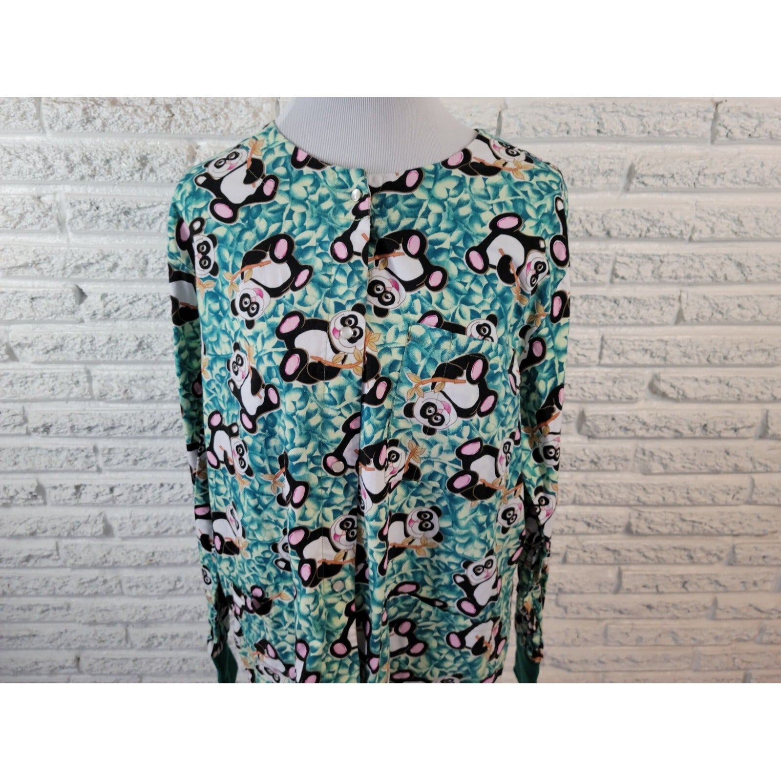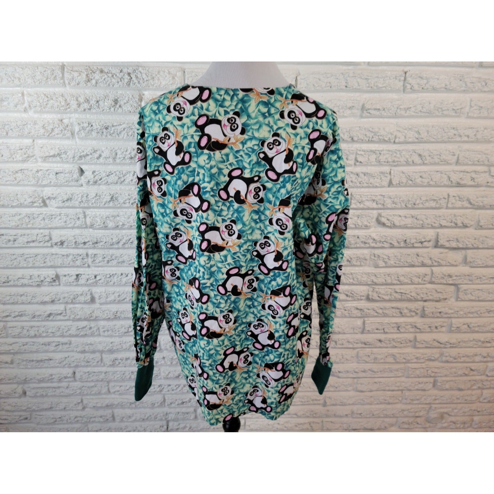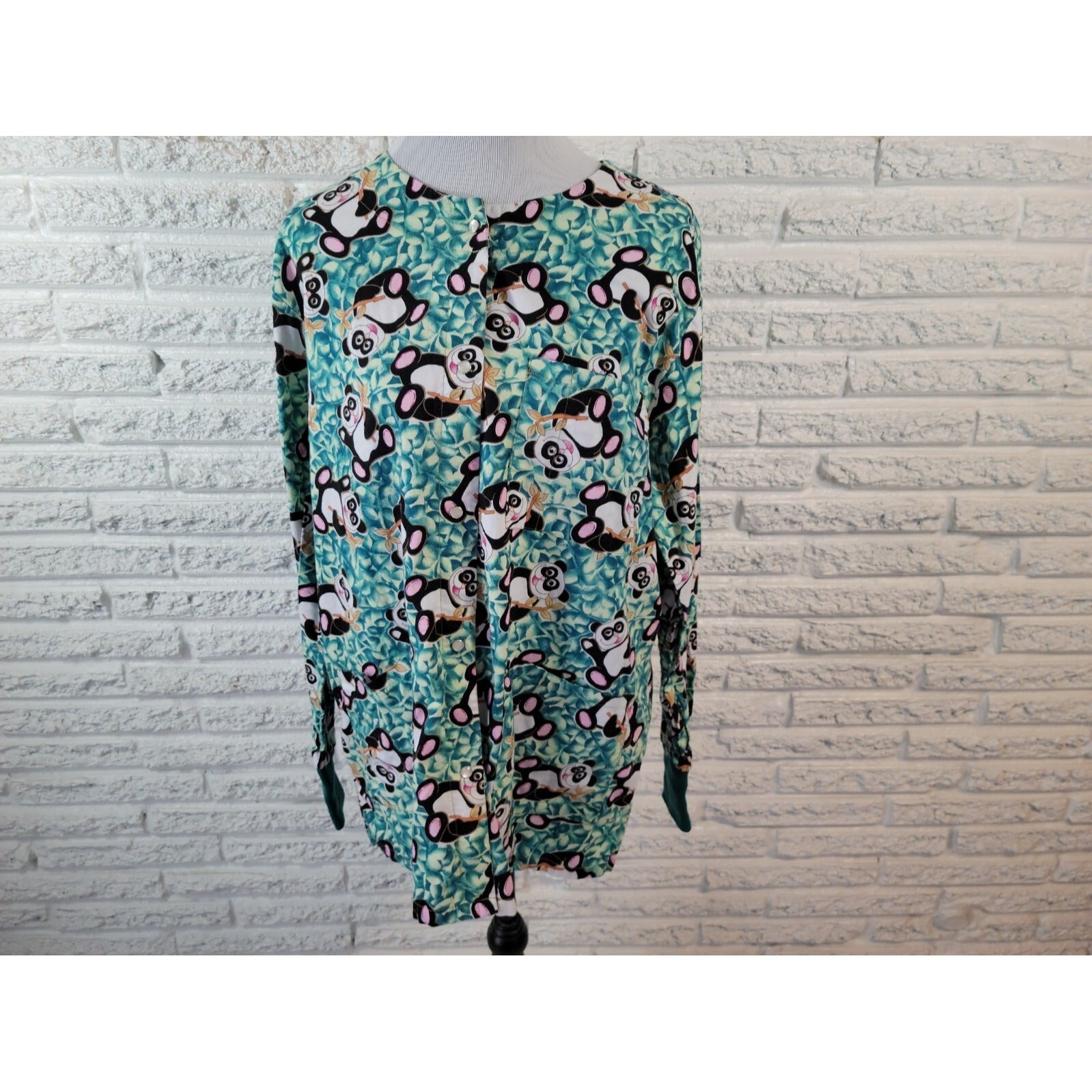 Trend Panda Bear Scrub Top Extra Large XL Long Sleeve Snap Up Poly Blend Blue