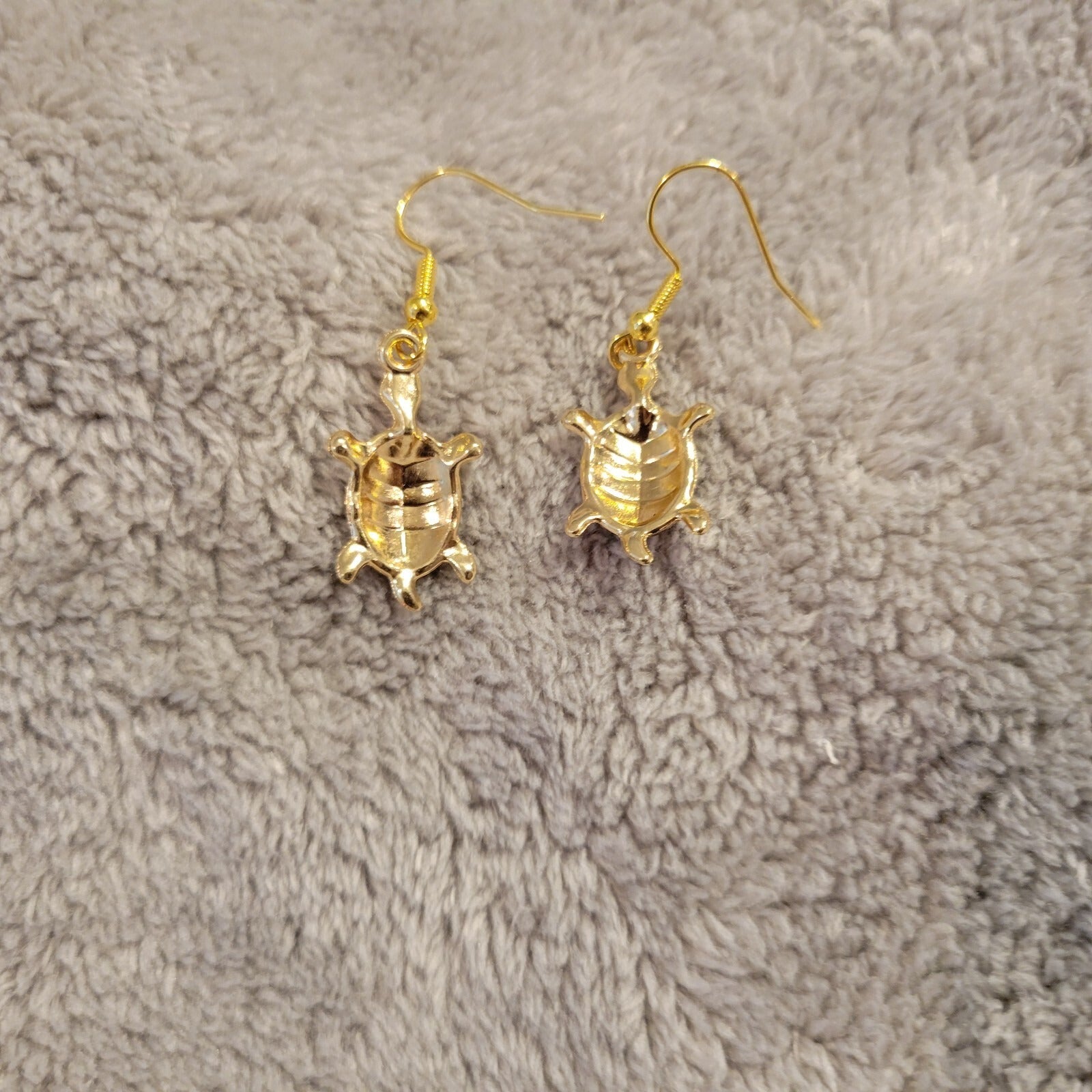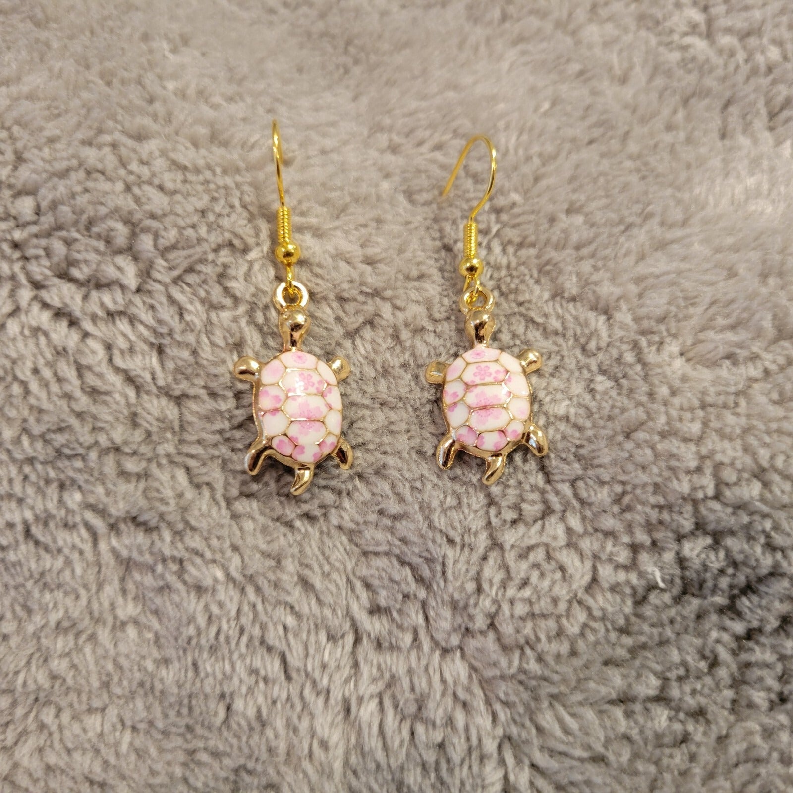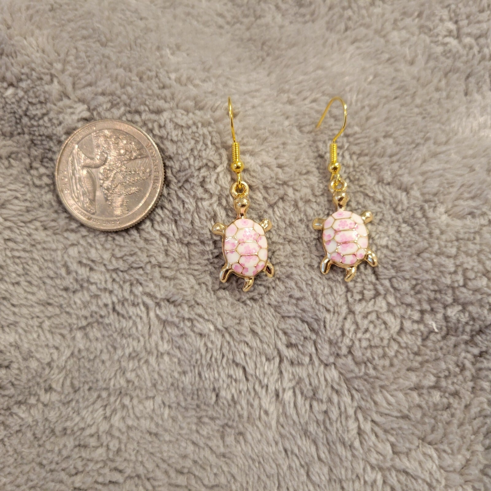 Turtles #2 Womens Earrings One Pair Zinc Alloy Pink White Hanging Gold Tone