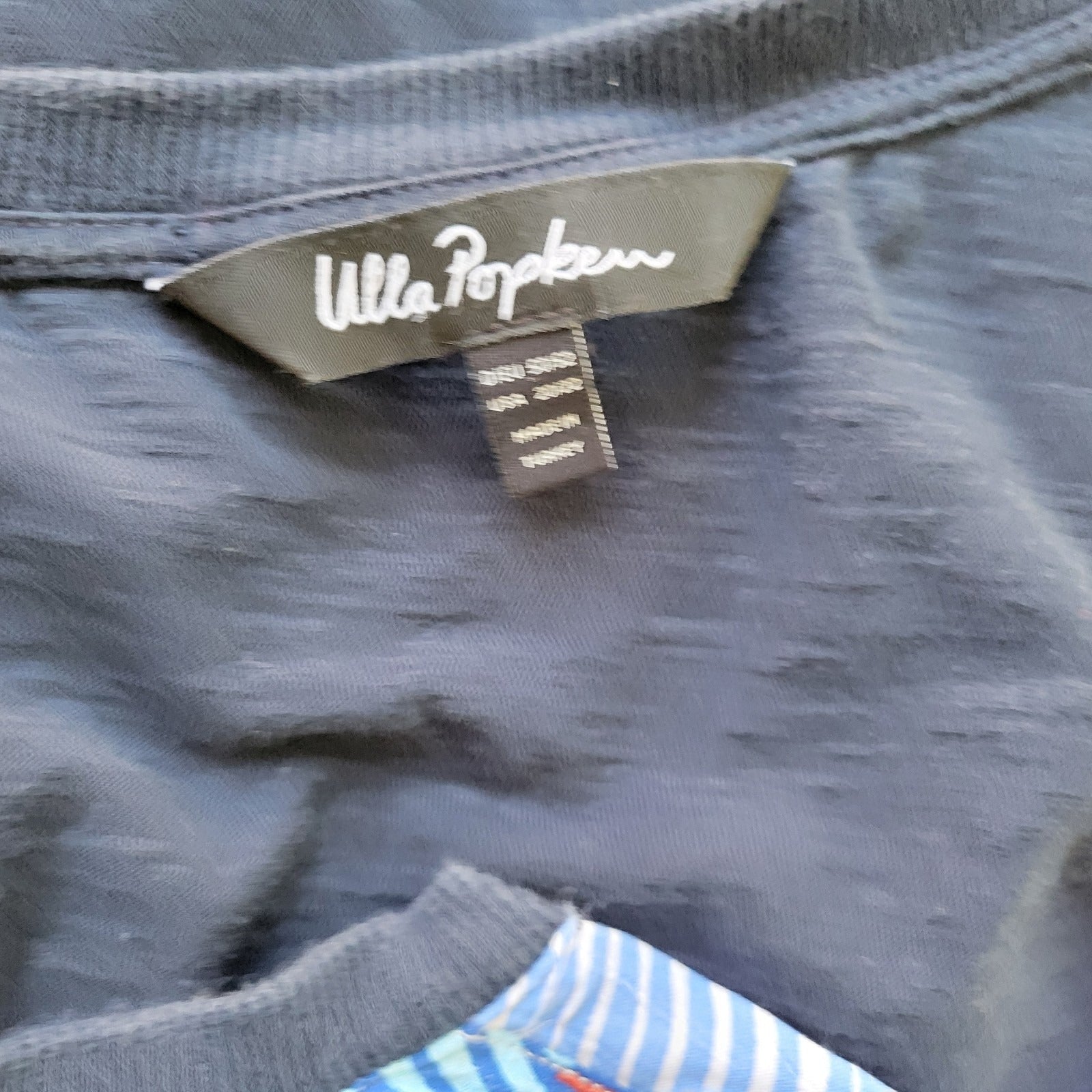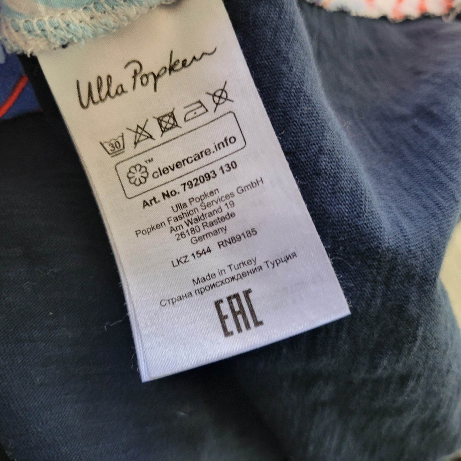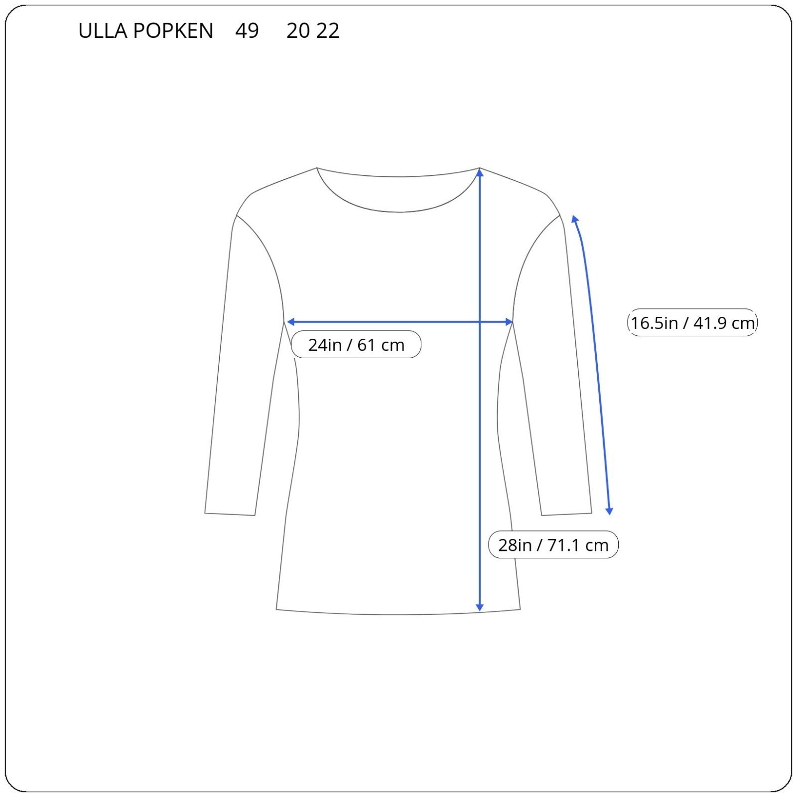 The Ulla Popken Women's Top in size 20-22 features a stylish blue geometric pattern with 3/4 sleeves and a V-neckline. Made from lightweight viscose material, this pullover blouse is perfect for casual wear or travel. Its regular fit and plus size make it a comfortable and versatile option for all seasons, including winter, summer, fall, and spring. Easy to care for with machine washable instructions, this basic top from Ulla Popken offers a classic yet chic style for any wardrobe.