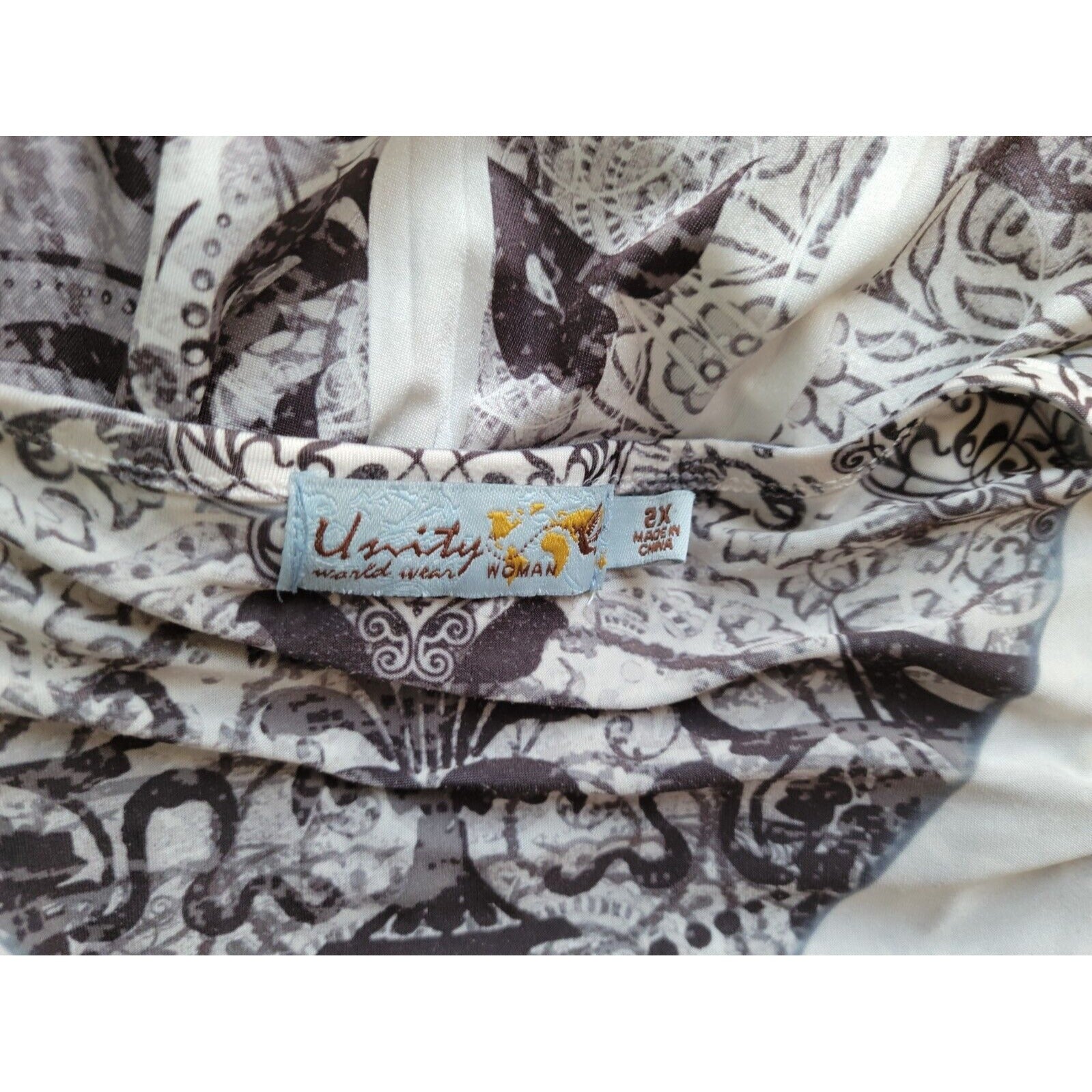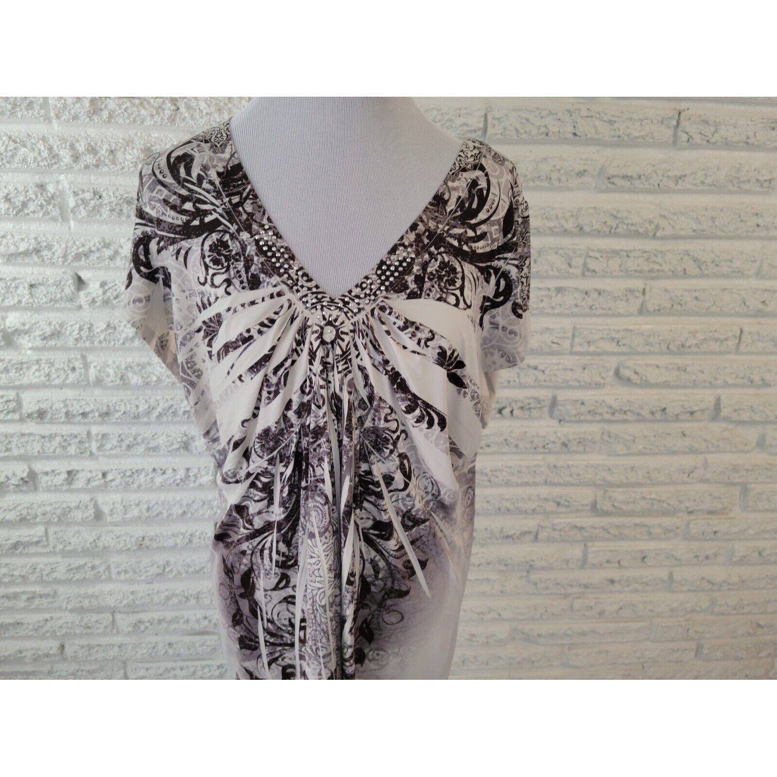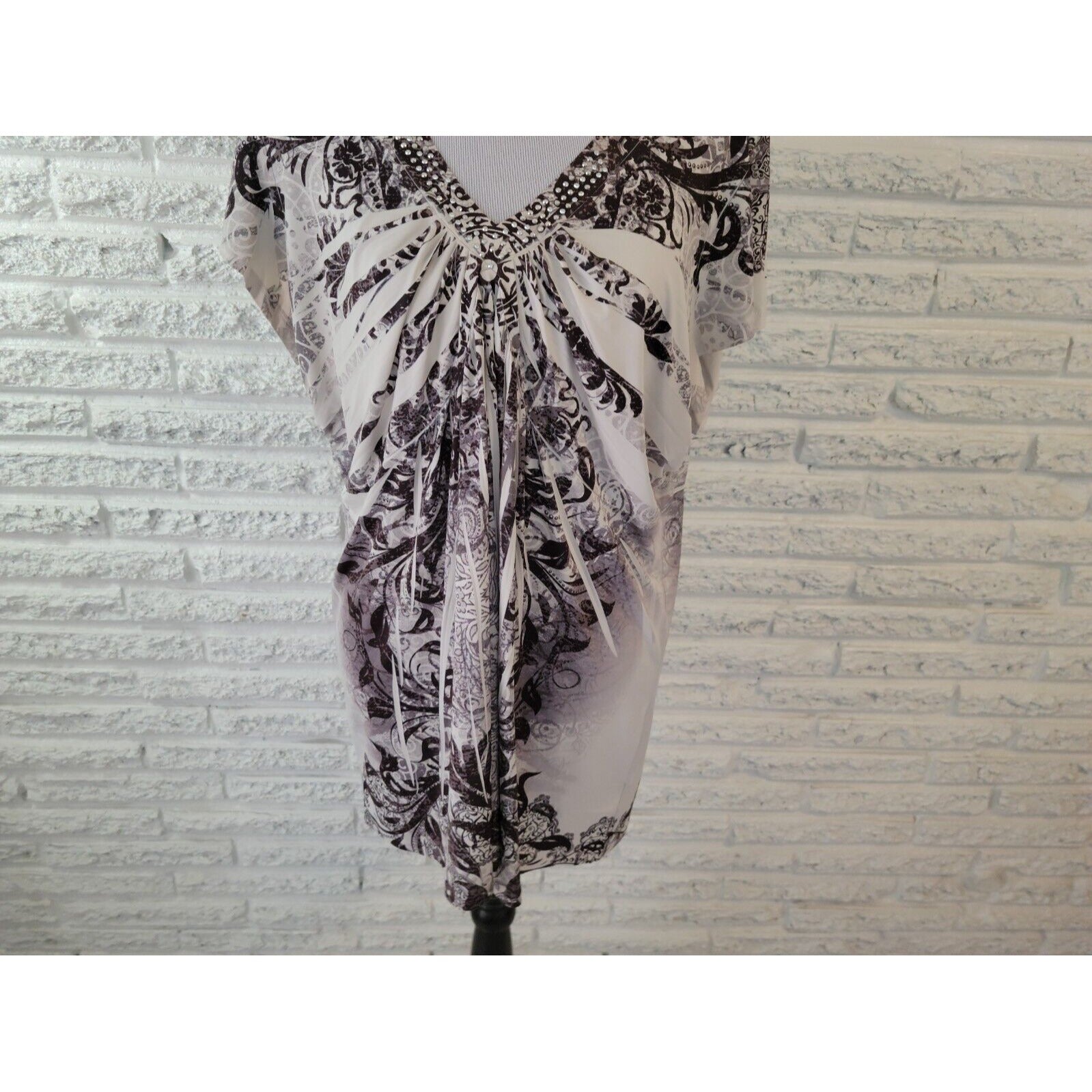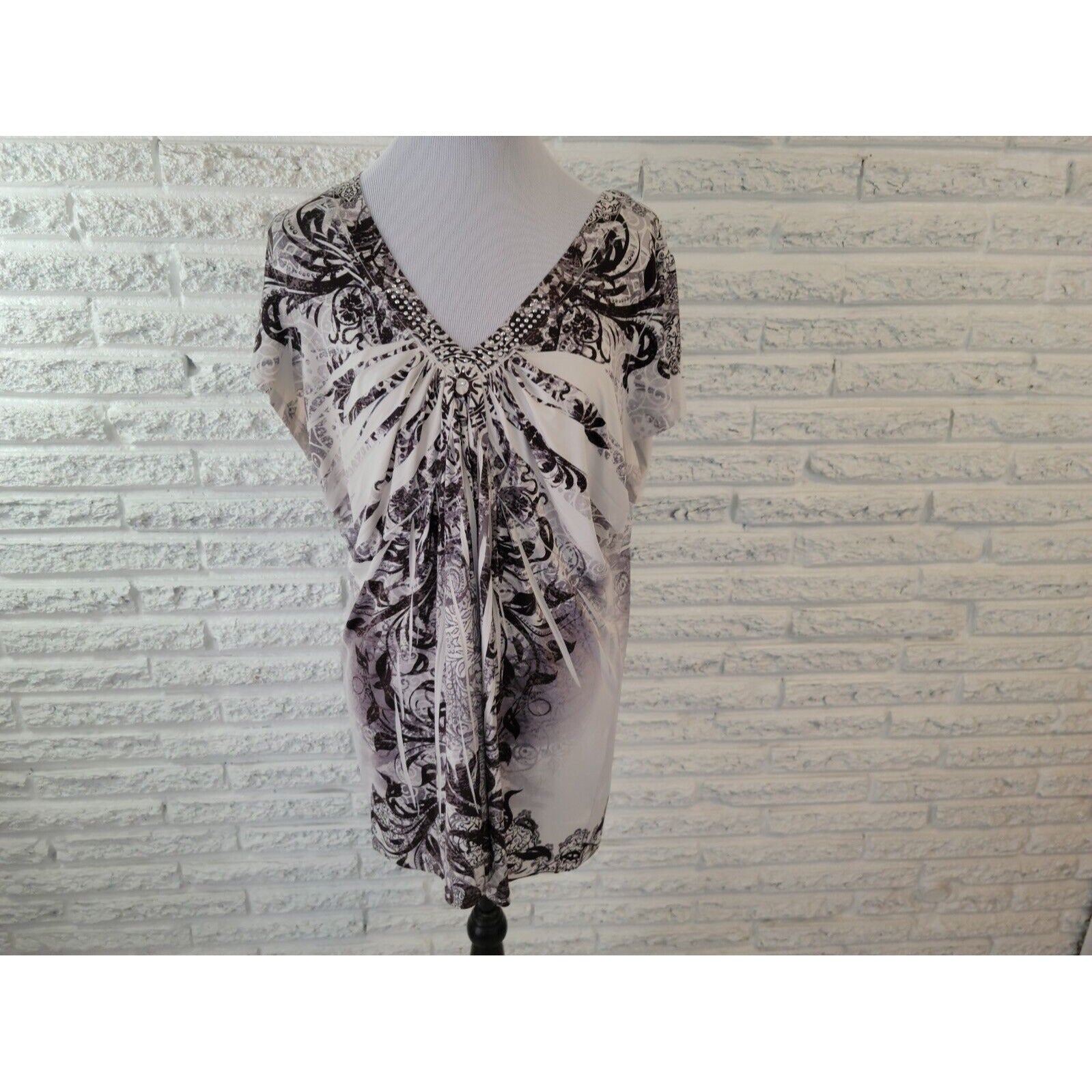Unity Women Top 2X Plus Cap Sleeve Studded Pleated Black Geometric Sublimation