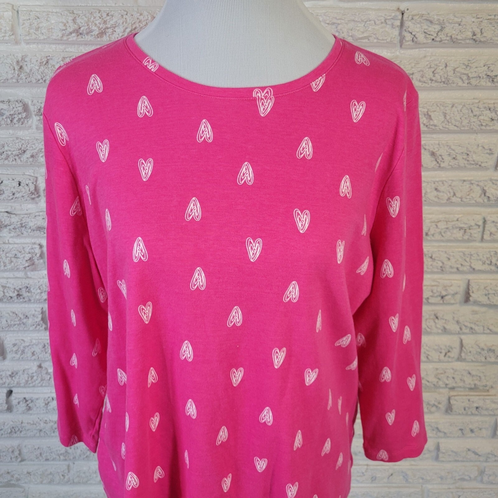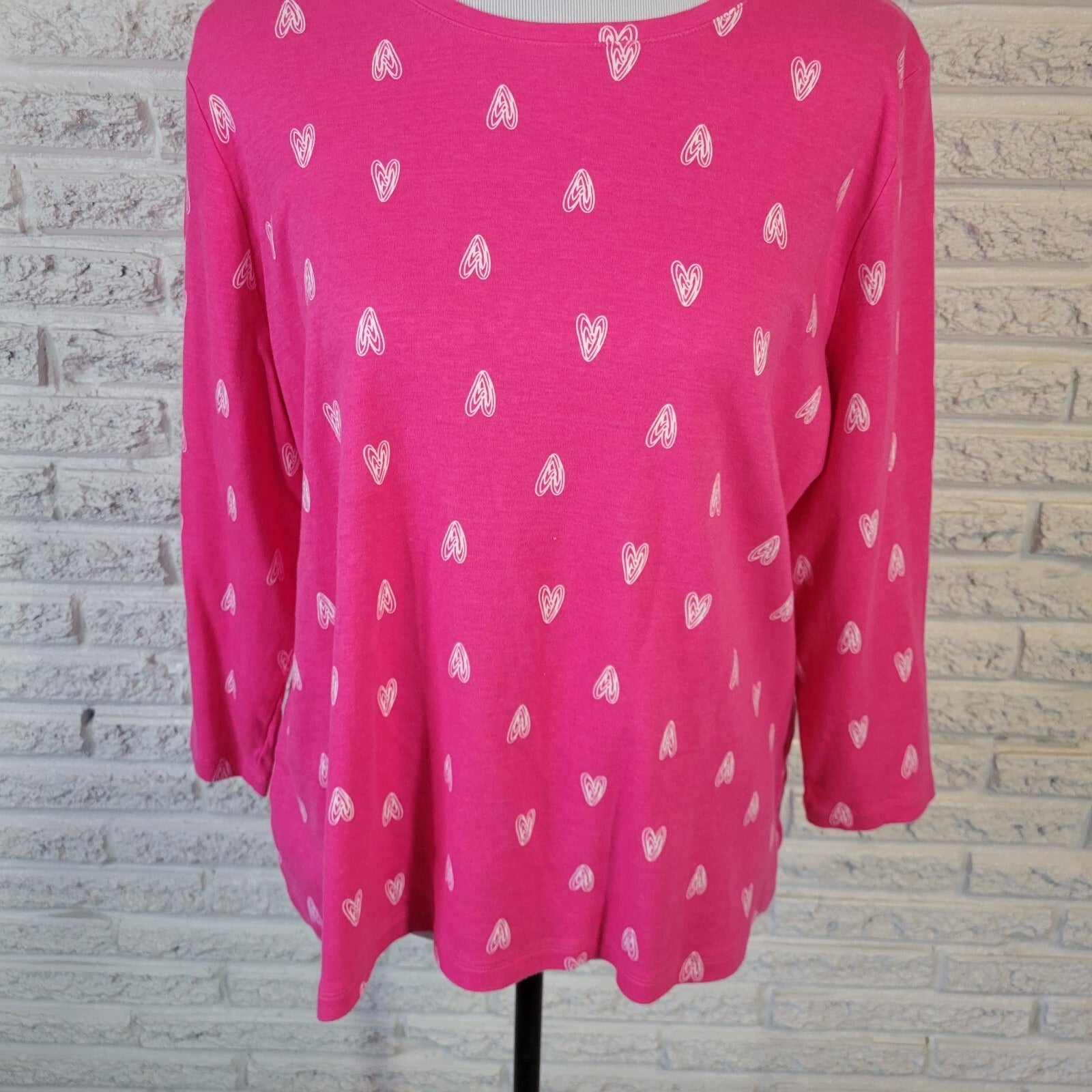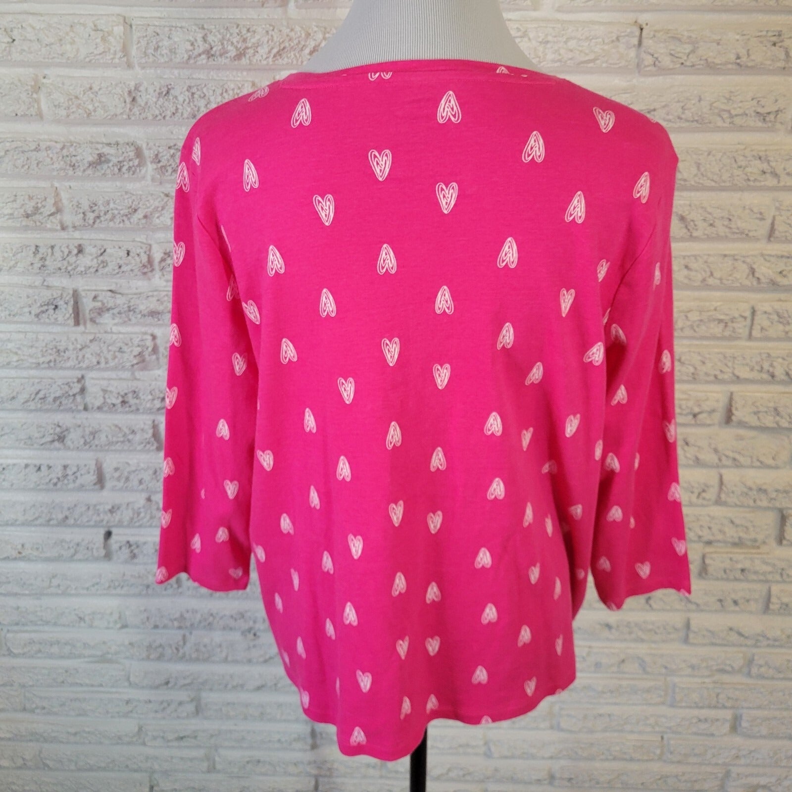 Valentines Day Kim Rogers Womens Top XL 3/4 Sleeve Cotton Pink Hearts All Over